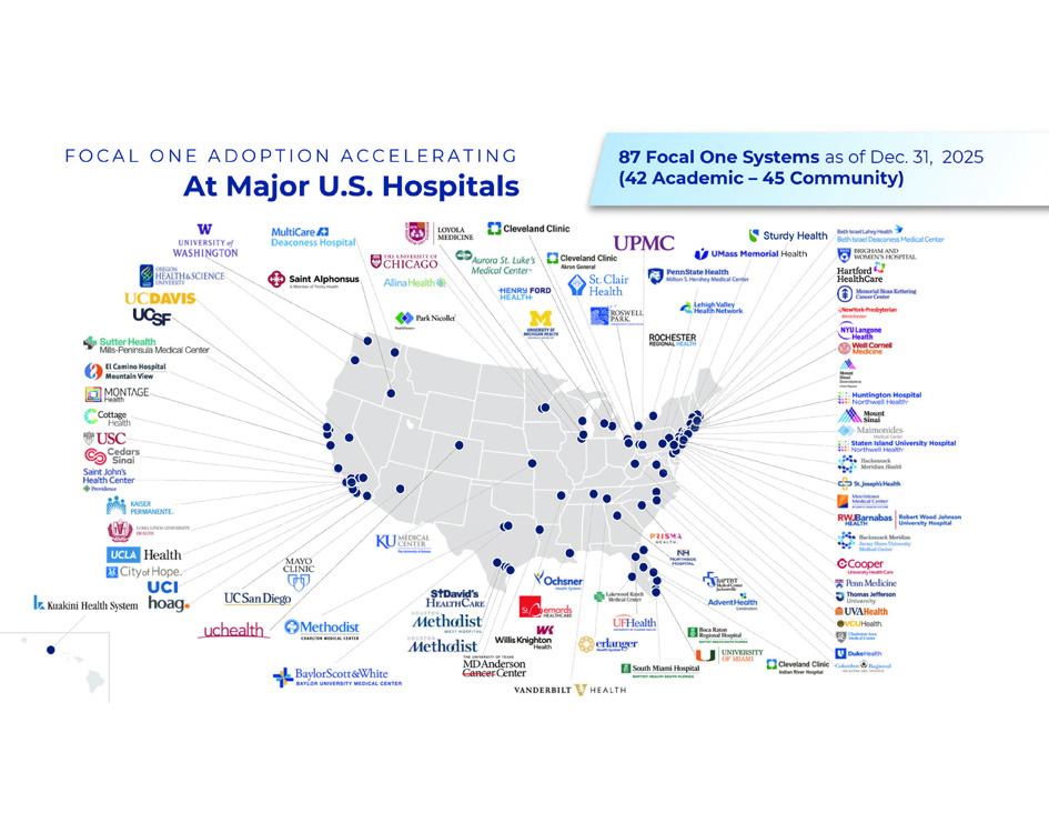 FO CA L O NE A D O P T I O N A CCE L E R A T I NG At Major U.S. Hospitals 87 Focal One Systems as of Dec. 31, 2025 (42 Academic – 45 Community)