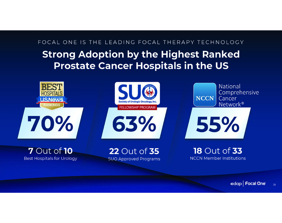 Strong Adoption by the Highest Ranked Prostate Cancer Hospitals in the US FO C A L O N E I S T H E L E A D I N G FO C A L T H E RA P Y T E C H N O L O G Y 70% 7 Out of 10 Best Hospitals for Urology National Comprehensive Cancer Network® 55% 18 Out of 33 NCCN Member Institutions 63% 22 Out of 35 SUO Approved Programs 26