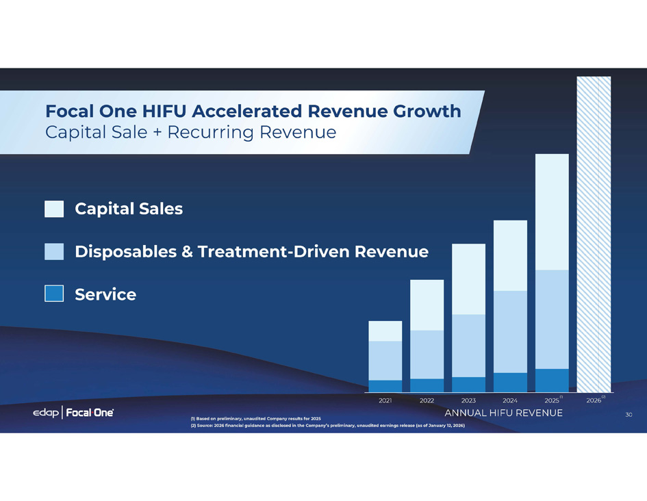 30 30 2021 2022 2023 2024 Focal One HIFU Accelerated Revenue Growth Capital Sale + Recurring Revenue Capital Sales Disposables & Treatment - Driven Revenue Service (1) 2025 ANNUAL HIFU REVENUE (1) Based on preliminary, unaudited Company results for 2025 (2) Source: 2026 financial guidance as disclosed in the Company’s preliminary, unaudited earnings release (as of January 12, 2026) (2) 2026