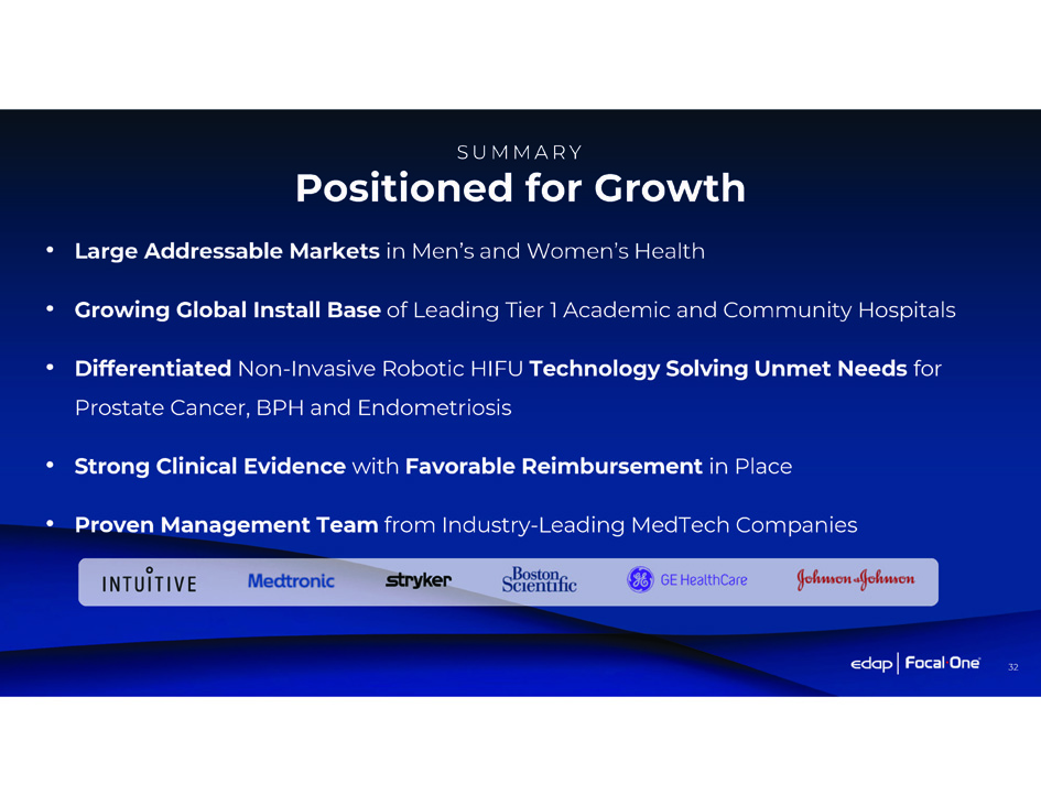 31 HIFU Unlocks a Large Market Opportunity (1) Newly Diagnosed Cases per year From World Health Organization – Globocan 2022 (2) From WHO and Habib N et al. Bowel Endometriosis: Current Perspectives on Diagnosis and Treatment. Int J Womens Health. 2020 (3) Xu et al.. Global, Regional, and National Incidence and Year Lived with Disability for Benign Prostatic Hyperplasia from 1990 to 2019. Am J Mens Health. 2021 (4) Based on UN Population Division and Goehring et al. Epidemiology of benign breast disease, with special attention to histologic types. Epidemiol Rev. 1997 (5) Based on UN Population Division and Bomeli et al. Evaluation of a thyroid nodule. Otolaryngol Clin North Am. 2010 20.5 M (2) Rectal Endometriosis 1.5 M Prostate Cancer (1) 11.3 M (3) BPH (Benign Prostatic Hyperplasia) 510,992 (1) Pancreatic Cancer 866,136 (1) Liver Cancer 51.4 M (5) Thyroid Nodules 2.3 M (1) Breast Cancer 8.3 M (4) Breast Fibroadenoma
