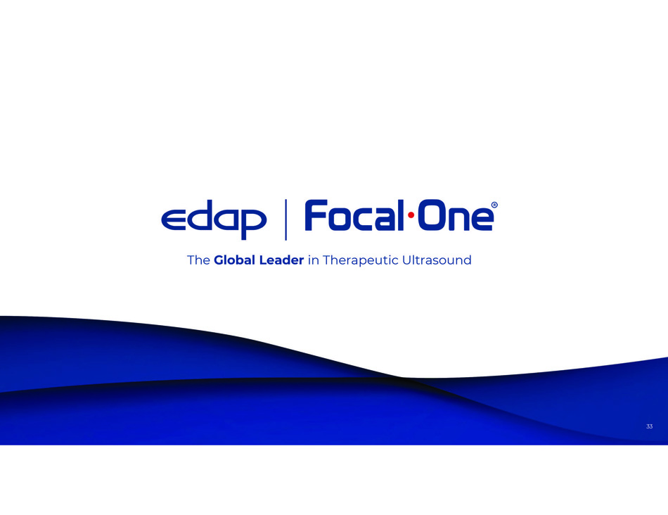 Positioned for Growth SU MMA R Y • Large Addressable Markets in Men’s and Women’s Health • Growing Global Install Base of Leading Tier 1 Academic and Community Hospitals • Differentiated Non - Invasive Robotic HIFU Technology Solving Unmet Needs for Prostate Cancer, BPH and Endometriosis • Strong Clinical Evidence with Favorable Reimbursement in Place • Proven Management Team from Industry - Leading MedTech Companies 32