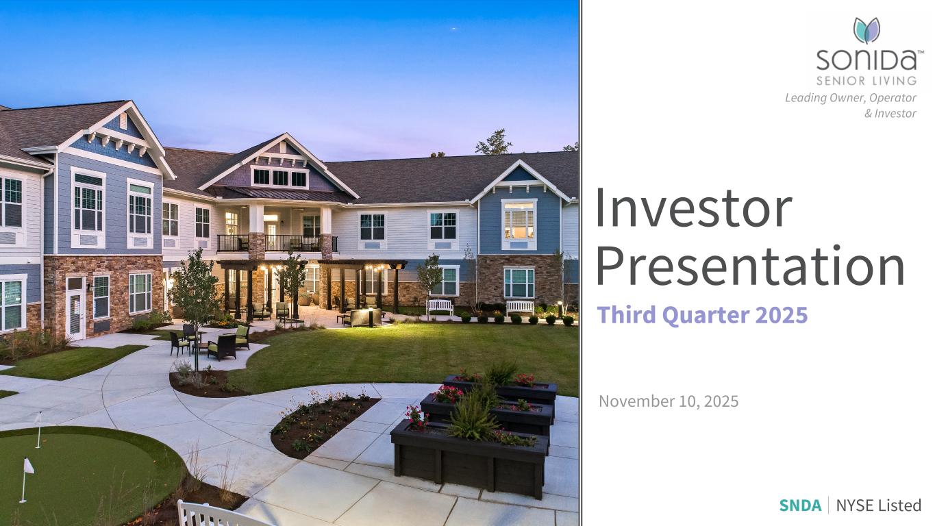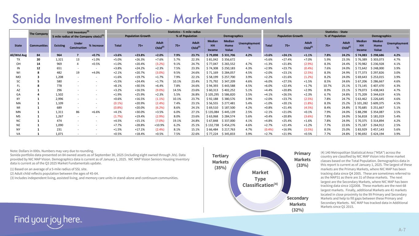 Sonida Investment Portfolio - Market Fundamentals A-7 (1) Based on an average of a 5-mile radius of SSL site. (2) Adult child reflects population between the ages of 45-64. (3) Includes independent living, assisted living, and memory care units in stand-alone and continuum communities. Primary Markets (33%) Secondary Markets (32%) Tertiary Markets (35%) Market Type Classification(4) Note: Dollars in 000s. Numbers may vary due to rounding. Sonida portfolio data presented on 84 owned assets as of September 30, 2025 (including eight owned through JVs). Data provided by NIC MAP Vision. Demographics data is current as of January 1, 2025. NIC MAP Vision Seniors Housing Inventory data is current as of the Q3 2025 Market Fundamentals update. (4) 140 Metropolitan Statistical Area ("MSA") across the country are classified by NIC MAP Vision into three market classes based on the Total Population. Demographics data in this report is current as of January 1, 2025. The largest of these markets are the Primary Markets, where NIC MAP has been tracking data since Q4 2005. These are sometimes referred to as the MAP31 as there are 31 of these markets. The next largest are the Secondary Markets, where NIC MAP has been tracking data since 1Q2008. These markets are the next 68 largest markets. Finally, additional Markets are 41 markets located in close proximity to the 99 Primary and Secondary Markets and help to fill gaps between these Primary and Secondary Markets. NIC MAP has tracked data in Additional Markets since Q1 2015. State Communities Existing Under Construction % Increase Total 75+ Adult Child(2) 75+ Adult Child(2) Median HH Income Median Home Value Unemployment % Total 75+ Adult Child(2) 75+ Adult Child(2) Median HH Income Median Home Value Unemployment % All/Wtd Avg 84 964 7 +0.7% +3.6% +23.8% +2.0% 7.9% 23.7% $ 79,898 $ 331,706 4.2% +3.6% +24.1% +1.1% 7.8% 24.2% $ 74,083 $ 298,686 4.2% TX 20 1,321 13 +1.0% +5.0% +26.3% +7.6% 5.7% 22.3% $ 81,042 $ 356,672 - +5.6% +27.4% +7.0% 5.9% 23.3% $ 76,389 $ 303,073 4.7% OH 14 969 4 +0.5% +1.0% +20.4% (3.2%) 9.1% 24.7% $ 77,047 $ 265,552 4.7% +1.3% +21.8% (2.9%) 8.3% 24.4% $ 70,982 $ 236,928 4.1% IN 12 651 - - +3.8% +24.2% +2.3% 7.5% 23.3% $ 74,308 $ 250,183 4.3% +2.9% +23.7% (0.4%) 7.6% 24.0% $ 72,642 $ 248,000 3.9% WI 8 482 19 +4.0% +2.1% +20.7% (3.0%) 9.5% 24.6% $ 71,169 $ 284,057 4.5% +2.0% +23.1% (2.5%) 8.3% 24.9% $ 77,373 $ 297,826 3.0% MO 3 1,208 - - +1.6% +19.7% +1.7% 7.9% 22.1% $ 58,199 $ 257,700 3.9% +2.2% +21.6% (1.2%) 8.2% 24.0% $ 69,643 $ 253,015 3.9% SC 5 580 - - +5.5% +24.4% +1.7% 10.1% 23.4% $ 75,792 $ 347,209 4.6% +6.0% +27.5% +1.5% 8.5% 24.6% $ 67,206 $ 286,667 4.6% FL 8 778 - - +8.1% +30.5% +6.4% 7.8% 24.6% $ 94,393 $ 443,588 4.5% +6.0% +22.4% +1.7% 10.7% 25.1% $ 73,145 $ 407,470 4.3% AZ 1 296 - - +3.2% +16.5% (9.0%) 14.5% 23.6% $ 60,313 $ 402,252 5.1% +4.4% +20.8% +2.9% 8.9% 23.1% $ 79,073 $ 438,043 4.7% GA 4 1,502 - - +1.9% +25.9% +2.3% 5.5% 26.8% $ 105,295 $ 586,820 3.5% +4.1% +26.5% +2.3% 6.7% 24.8% $ 75,209 $ 344,619 4.5% KY 1 2,996 - - +0.6% +16.5% (1.1%) 10.1% 23.7% $ 92,188 $ 380,576 3.9% +2.0% +23.7% (2.5%) 7.8% 24.7% $ 63,462 $ 226,645 4.6% MA 1 1,109 - - (0.1%) +20.9% (2.4%) 7.4% 23.1% $ 56,555 $ 277,481 5.4% +1.0% +20.1% (1.8%) 8.3% 25.2% $ 101,282 $ 609,375 4.5% MI 1 689 - - (0.8%) +20.0% (6.2%) 8.6% 24.1% $ 69,510 $ 187,500 4.2% +0.8% +21.4% (4.5%) 8.4% 24.8% $ 70,685 $ 251,667 5.1% MN 1 1,311 86 +6.6% +4.1% +30.0% +3.5% 6.0% 27.1% $ 135,084 $ 445,139 2.5% +2.1% +21.0% +0.1% 7.9% 24.0% $ 88,298 $ 354,087 3.5% MS 1 1,267 - - (1.7%) +19.4% (2.9%) 8.0% 23.6% $ 63,068 $ 284,574 5.6% +0.4% +20.8% (3.6%) 7.8% 24.0% $ 56,818 $ 181,019 5.4% NC 1 474 - - +4.5% +15.1% (7.0%) 19.1% 24.8% $ 67,848 $ 337,000 4.1% +4.8% +25.4% +1.6% 7.8% 24.9% $ 70,375 $ 314,894 4.2% NE 1 1,090 - - +7.7% +28.8% +10.9% 6.2% 25.1% $ 132,738 $ 454,276 4.6% +2.7% +21.4% +1.2% 7.7% 22.6% $ 75,187 $ 264,912 2.5% NY 1 231 - - +1.5% +17.1% (2.4%) 8.1% 15.1% $ 66,484 $ 217,763 4.7% (0.4%) +16.9% (3.5%) 8.5% 25.0% $ 83,929 $ 457,143 5.6% VA 1 1,071 - - +0.5% +18.4% +0.5% 7.5% 22.6% $ 77,224 $ 345,833 3.9% +2.7% +21.9% +0.5% 7.7% 24.8% $ 90,692 $ 424,194 3.9% DemographicsThe Company Unit Inventory(3) Statistics - 5 mile radius Statistics - State 5 mile radius of the Company site(s)(1) Population Growth % of Population Demographics Population Growth % of Population