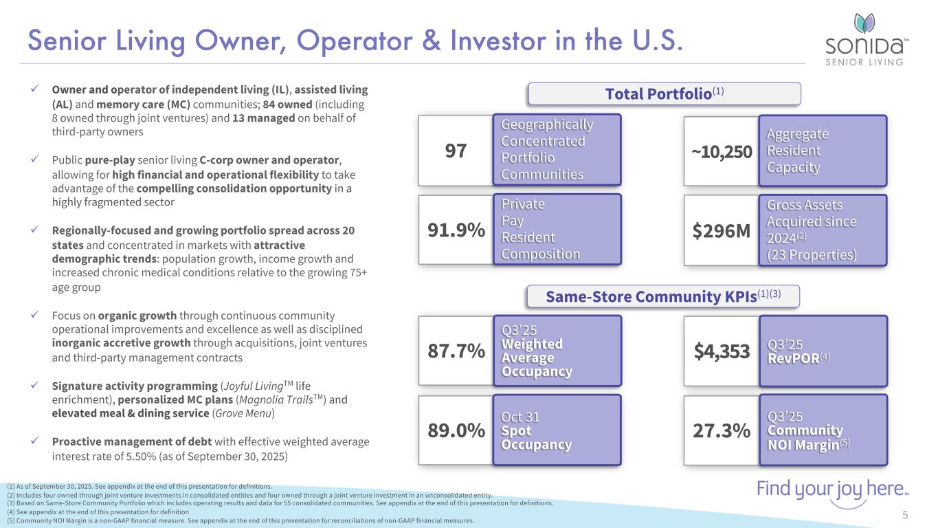 A-4 Community NOI Note: Dollars in 000s. Numbers may vary due to rounding. (1) Includes Second Person and Level of Care fees. (2) Includes benefits, overtime, payroll taxes and related labor costs, excluding contract labor. (3) Other Operating Expenses includes casualty gains and losses, settlement expense, non-income tax, non- property tax, and other expenses. (4) At-share applies to Sonida’s ownership share in JVs. KZ JV acquisition (Sonida’s 32.71% ownership share) and Palatine JV acquisition (Sonida’s 51% ownership share). (5) Excludes managed communities. (6) Excludes 146 Owned Units that are out of service. Total Units 9,342 Owned Units, At-Share (4)(5) 7,307 Available Units, At-Share (4)(5)(6) 7,161 Portfolio Unit Build (as of September 30, 2025) 2024 Q1 Q2 Q3 Q4 FY 2024 Q1 Q2 Q3 FY 2025 Resident Revenue Independent Living(1) 16,305$ 16,961$ 17,290$ 17,181$ 67,737$ 17,308$ 17,685$ 17,582$ 52,575$ Assisted Living(1) 26,841 28,237 28,181 28,619 111,878 29,368 30,077 30,254 89,699 Memory Care(1) 9,275 9,457 9,693 9,513 37,938 9,837 10,018 10,305 30,160 Community Fees 440 466 468 460 1,834 454 444 493 1,391 Other Income 272 242 273 266 1,053 271 300 294 865 Total Same-Store Community Resident Revenue 53,133 55,363 55,905 56,039 220,440 57,238 58,524 58,928 174,690 Resident Revenue for Non Same-Store Communities 7,604 7,745 11,046 21,014 47,409 22,017 23,321 25,669 71,007 Consolidated Resident Revenue 60,737 63,108 66,951 77,053 267,849 79,255 81,845 84,597 245,697 Less: Noncontrolling Interest - - (1,584) (1,516) (3,100) (1,607) (1,752) (1,836) (5,195) Plus: Pro Rata Resident Revenue for Unconsolidated Joint Venture - 799 2,139 2,073 5,011 2,287 2,334 2,407 7,028 Total Resident Revenue, At-Share 60,737$ 63,907$ 67,506$ 77,610$ 269,760$ 79,935$ 82,427$ 85,168$ 247,530$ Adjusted Operating Expenses Total Labor And Related Expenses(2) 24,711$ 24,020$ 24,616$ 25,232$ 98,579$ 25,826$ 26,081$ 27,120$ 79,027$ Contract Labor 311 554 571 362 1,798 364 490 (88) 766 Food 2,782 2,961 2,973 2,960 11,676 2,550 2,873 3,016 8,439 Utilities 2,948 2,352 2,820 2,619 10,739 3,149 2,625 2,993 8,767 Real Estate Taxes 1,817 2,076 1,884 1,788 7,565 1,915 1,990 1,945 5,850 Advertising And Promotions 930 920 1,009 981 3,840 1,033 997 1,049 3,079 Insurance 1,188 1,179 1,107 1,128 4,602 1,132 1,087 1,150 3,369 Supplies 969 915 905 985 3,774 867 914 886 2,667 Service Contracts 1,253 1,181 1,257 1,346 5,037 1,548 1,402 1,470 4,420 All Other Operating Expenses 2,985 3,049 3,084 3,363 12,481 2,800 3,351 3,300 9,451 Total Same-Store Adjusted Operating Expense 39,894 39,207 40,226 40,764 160,091 41,184 41,810 42,841 125,835 Adjusted Operating Expenses for Non Same-Store Communities 5,928 6,285 9,636 17,241 39,090 17,930 18,799 20,992 57,721 Other Operating Expenses(3) 495 489 630 1,220 2,834 1,300 811 1,315 3,426 Total Operating Expense 46,317 45,981 50,492 59,225 202,015 60,414 61,420 65,148 186,982 Less: Other Operating Expenses(3) (495) (489) (630) (1,220) (2,834) (1,300) (811) (1,315) (3,426) Less: Noncontrolling Interest - (1,371) (1,455) (2,826) (1,414) (1,477) (1,470) (4,361) Plus: Pro Rata Operating Expenses for Unconsolidated Joint Venture 558 1,642 1,857 4,057 1,783 1,830 1,797 5,410 Total Adjusted Operating Expenses, At-Share 45,822$ 46,050$ 50,133$ 58,407$ 200,412$ 59,483$ 60,962$ 64,160$ 184,605$ Net Operating Income Same-Store Community NOI 13,239$ 16,156$ 15,679$ 15,275$ 60,349$ 16,054$ 16,714$ 16,087$ 48,855$ Same-Store Community NOI Margin 24.9% 29.2% 28.0% 27.3% 27.4% 28.0% 28.6% 27.3% 28.0% Non Same-Store Community NOI 1,676$ 1,460$ 1,410$ 3,773$ 8,319$ 4,087$ 4,522$ 4,677$ 13,286$ Non Same-Store Community NOI Margin 22.0% 18.9% 12.8% 18.0% 17.5% 18.6% 19.4% 18.2% 18.7% Total Community NOI 14,915$ 17,616$ 17,089$ 19,048$ 68,668$ 20,141$ 21,236$ 20,764$ 62,141$ Less: Noncontrolling Interest -$ (213)$ (60)$ (273)$ (193)$ (275)$ (366)$ (834)$ Plus: Pro Rata NOI for Unconsolidated Joint Venture 241$ 497$ 215$ 953$ 504$ 504$ 610$ 1,618$ Total Community NOI, At-Share 14,915$ 17,857$ 17,373$ 19,203$ 69,348$ 20,452$ 21,465$ 21,008$ 62,925$ 2025