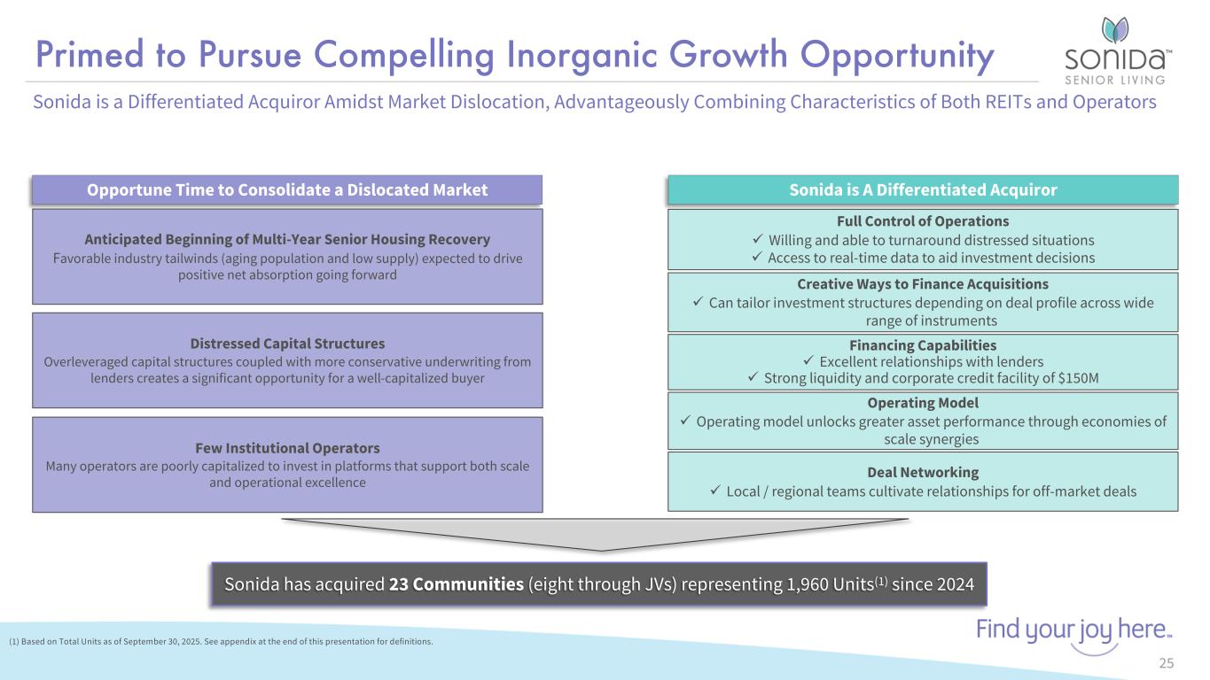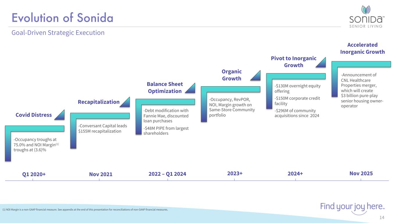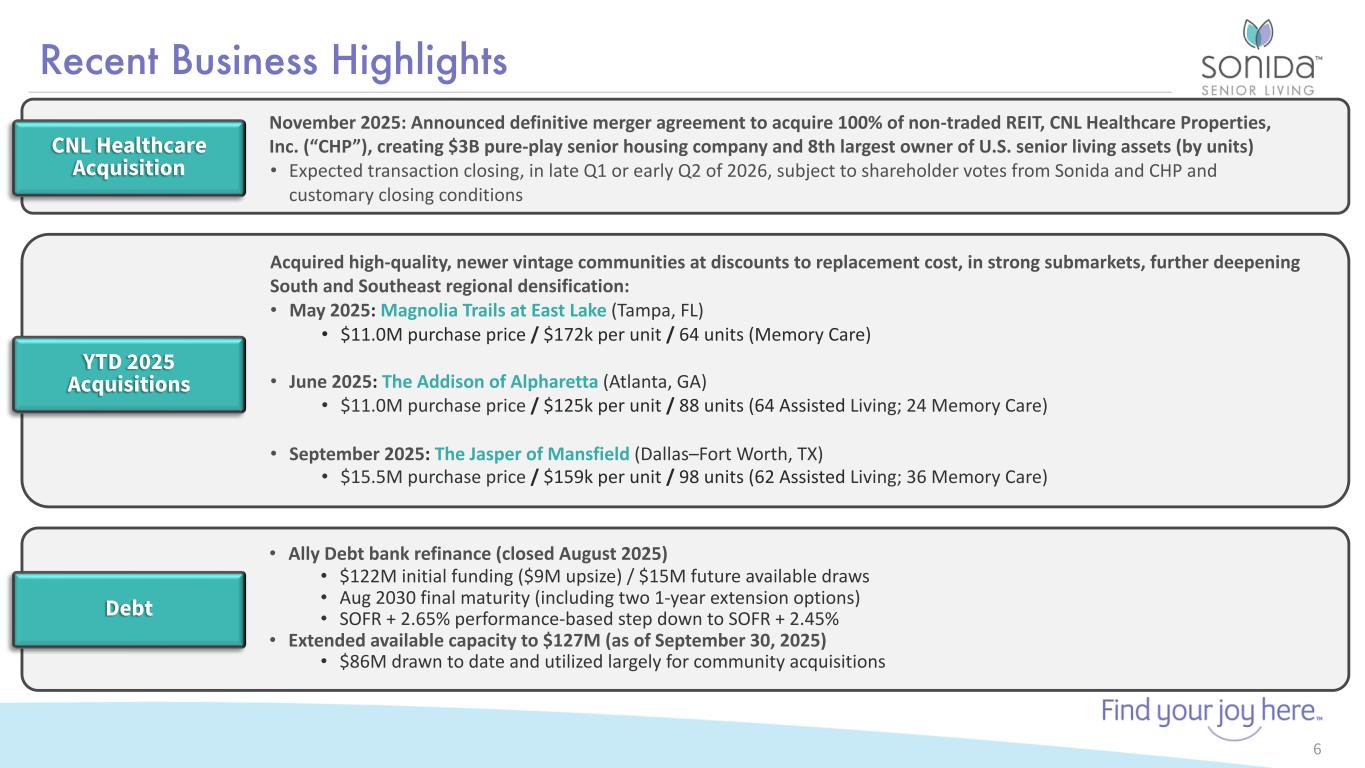 Disclaimer 3 Important Information and Where to Find It This presentation includes information that relates to a proposed transaction involving the Sonida Senior Living, Inc. (“Sonida”) and CNL Healthcare Properties, Inc. (“CHP”). In connection with the proposed transaction, Sonida and CHP will each file relevant materials with the SEC, including a registration statement on Form S-4 to register the shares of Sonida common stock to be issued to the CHP stockholders in connection with the proposed transaction. The registration statement will include a joint proxy statement/prospectus which will be sent to the stockholders of CHP and the stockholders of Sonida seeking their respective approval of the transaction. Sonida and CHP may also file other documents regarding the proposed transaction with the SEC. This communication is not intended to be, and is not, a substitute for such filings or for any other document that Sonida and/or CHP may file with the SEC in connection with the proposed transaction. BEFORE MAKING ANY VOTING DECISION, SONIDA’S AND CHP’S RESPECTIVE STOCKHOLDERS ARE URGED TO READ ALL RELEVANT DOCUMENTS FILED OR TO BE FILED WITH THE SEC, INCLUDING THE REGISTRATION STATEMENT ON FORM S-4 AND THE RELATED JOINT PROXY STATEMENT/PROSPECTUS, AS WELL AS ANY AMENDMENTS OR SUPPLEMENTS TO THOSE DOCUMENTS AND ANY OTHER RELEVANT DOCUMENTS TO BE FILED WITH THE SEC IN CONNECTION WITH THE PROPOSED TRANSACTION WHEN THEY BECOME AVAILABLE, BECAUSE THEY WILL CONTAIN IMPORTANT INFORMATION ABOUT SONIDA, CHP AND THE PROPOSED TRANSACTION. Investors and shareholders may obtain copies of these documents and other documents filed by Sonida and CHP with the SEC free of charge through the website maintained by the SEC at www.sec.gov or from Sonida at its website, sonidaseniorliving.com, under the heading Investor Relations, or from CHP at its website, cnlhealthcareproperties.com. Participants in the Solicitation Sonida and CHP, their respective directors and certain of their respective executive officers may be deemed to be participants in the solicitation of proxies in connection with the proposed transaction under the rules of the SEC. Information about the interests of the directors and executive officers of Sonida and CHP and other persons who may be deemed to be participants in the solicitation of proxies in connection with the proposed transaction and a description of their direct and indirect interests, by security holdings or otherwise, will be included in the joint proxy statement/prospectus related to the transaction, which will be filed with the SEC. Information about the directors and executive officers of Sonida and their ownership of Sonida equity interests can be found in Sonida’s definitive proxy statement in connection with its 2025 Annual Meeting of Stockholders, filed with the SEC on April 29, 2025; in the Form 3 and Form 4 statements of beneficial ownership and statements of changes in beneficial ownership filed with the SEC by Sonida’s directors and executive officers; and in other documents filed by Sonida with the SEC. Information about the directors and executive officers of CHP and their ownership of CHP equity interests is set forth in the definitive proxy statement for CHP’s 2024 Annual Meeting of Stockholders, filed with the SEC on September 16, 2024 and in other documents filed by CHP with the SEC.