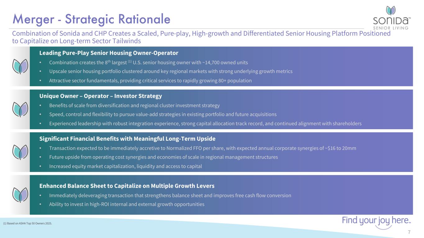 Recent Business Highlights 6 YTD 2025 Acquisitions • Ally Debt bank refinance (closed August 2025) • $122M initial funding ($9M upsize) / $15M future available draws • Aug 2030 final maturity (including two 1-year extension options) • SOFR + 2.65% performance-based step down to SOFR + 2.45% • Extended available capacity to $127M (as of September 30, 2025) • $86M drawn to date and utilized largely for community acquisitions Acquired high-quality, newer vintage communities at discounts to replacement cost, in strong submarkets, further deepening South and Southeast regional densification: • May 2025: Magnolia Trails at East Lake (Tampa, FL) • $11.0M purchase price / $172k per unit / 64 units (Memory Care) • June 2025: The Addison of Alpharetta (Atlanta, GA) • $11.0M purchase price / $125k per unit / 88 units (64 Assisted Living; 24 Memory Care) • September 2025: The Jasper of Mansfield (Dallas–Fort Worth, TX) • $15.5M purchase price / $159k per unit / 98 units (62 Assisted Living; 36 Memory Care) Debt November 2025: Announced definitive merger agreement to acquire 100% of non-traded REIT, CNL Healthcare Properties, Inc. (“CHP”), creating $3B pure-play senior housing company and 8th largest owner of U.S. senior living assets (by units) • Expected transaction closing, in late Q1 or early Q2 of 2026, subject to shareholder votes from Sonida and CHP and customary closing conditions CNL Healthcare Acquisition