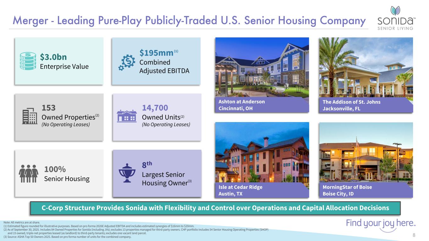 Merger - Strategic Rationale Combination of Sonida and CHP Creates a Scaled, Pure-play, High-growth and Differentiated Senior Housing Platform Positioned to Capitalize on Long-term Sector Tailwinds Leading Pure-Play Senior Housing Owner-Operator • Combination creates the 8th largest (1) U.S. senior housing owner with ~14,700 owned units • Upscale senior housing portfolio clustered around key regional markets with strong underlying growth metrics • Attractive sector fundamentals, providing critical services to rapidly growing 80+ population 7 Unique Owner – Operator – Investor Strategy • Benefits of scale from diversification and regional cluster investment strategy • Speed, control and flexibility to pursue value-add strategies in existing portfolio and future acquisitions • Experienced leadership with robust integration experience, strong capital allocation track record, and continued alignment with shareholders Significant Financial Benefits with Meaningful Long-Term Upside • Transaction expected to be immediately accretive to Normalized FFO per share, with expected annual corporate synergies of ~$16 to 20mm • Future upside from operating cost synergies and economies of scale in regional management structures • Increased equity market capitalization, liquidity and access to capital Enhanced Balance Sheet to Capitalize on Multiple Growth Levers • Immediately deleveraging transaction that strengthens balance sheet and improves free cash flow conversion • Ability to invest in high-ROI internal and external growth opportunities (1) Based on ASHA Top 50 Owners 2025.