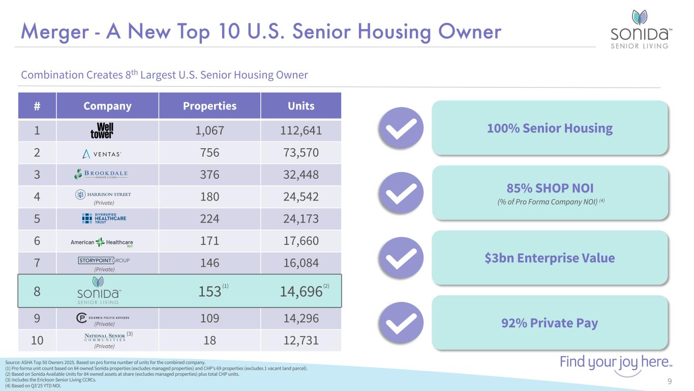 Merger - Leading Pure-Play Publicly-Traded U.S. Senior Housing Company Ashton at Anderson Cincinnati, OH 8 Note: All metrics are at share. (1) Estimated figure rounded for illustrative purposes. Based on pro forma 2026E Adjusted EBITDA and includes estimated synergies of $16mm to $20mm. (2) As of September 30, 2025. Includes 84 Owned Properties for Sonida (including JVs); excludes 13 properties managed for third-party owners. CHP portfolio includes 54 Senior Housing Operating Properties (SHOP) and 15 owned, triple-net properties leased (as landlord) to third-party tenants; excludes one vacant land parcel. (3) Source: ASHA Top 50 Owners 2025. Based on pro forma number of units for the combined company. $3.0bn Enterprise Value Isle at Cedar Ridge Austin, TX MorningStar of Boise Boise City, ID The Addison of St. Johns Jacksonville, FL $195mm Combined Adjusted EBITDA (1) 14,700 Owned Units(2) (No Operating Leases) 100% Senior Housing 8th Largest Senior Housing Owner(3) 153 Owned Properties(2) (No Operating Leases) C-Corp Structure Provides Sonida with Flexibility and Control over Operations and Capital Allocation Decisions