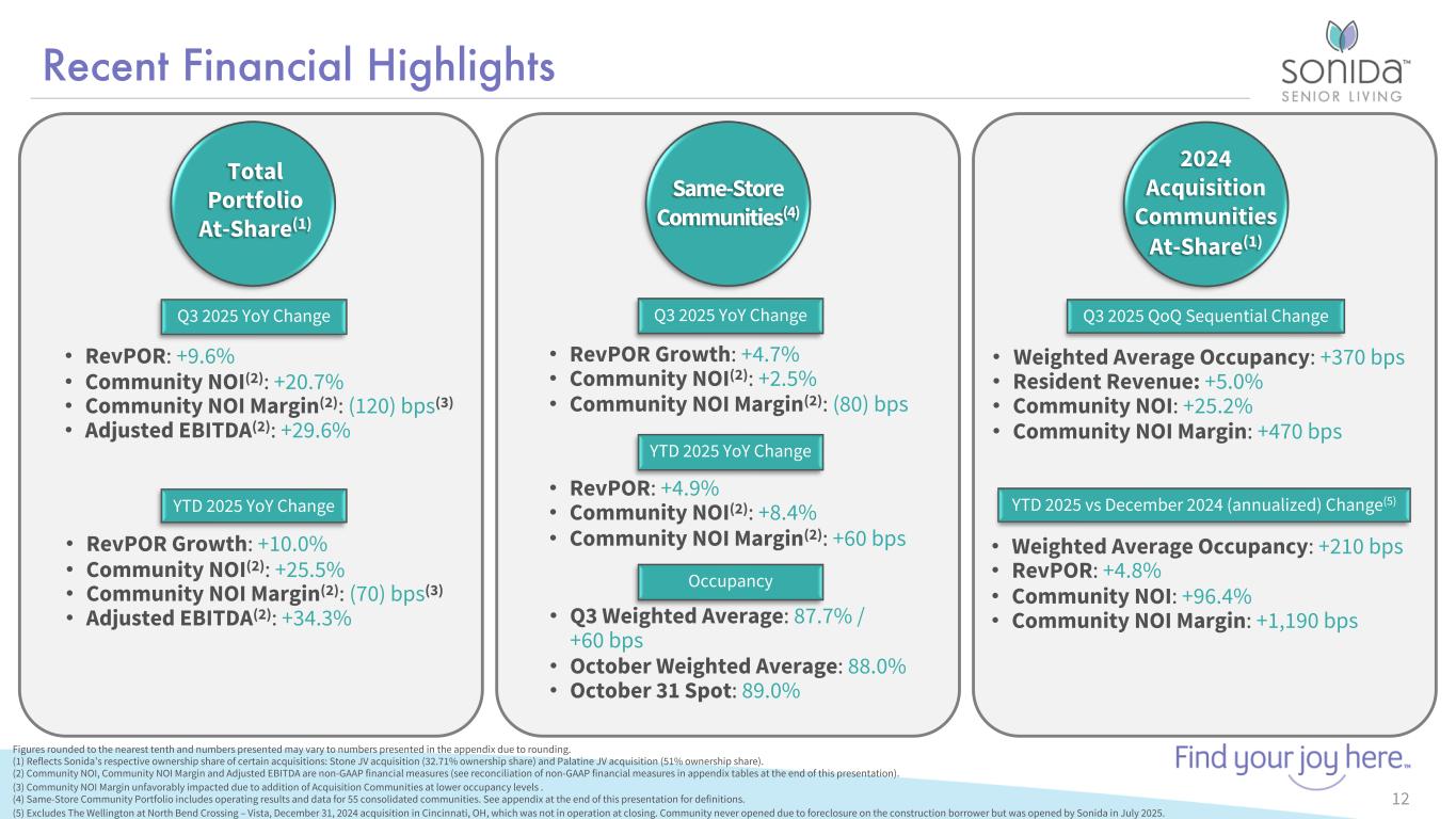 TX 23% OH 17% IN 11% WI 8% FL 6% Other 35% Sonida Senior Living Footprint 15+ Communities 5 - 14 Communities < 5 Communities Managed Owned Portfolio Mix by State Regionally-Concentrated Portfolio in Markets with Positive Demographic Trends (1) Based on Total Portfolio as of September 30, 2025. See appendix at the end of this presentation for definitions. (2) Includes four owned through joint venture investments in consolidated entities and four owned through a joint venture investment in an unconsolidated entity. (3) Based on Total Units as of September 30, 2025. See appendix at the end of this presentation for definitions. (4) Based on Total Owned Operating Portfolio as of September 30, 2025. See appendix at the end of this presentation for definitions). (5) Data based on Q3’25 average. % of Total Units(3) AL 48% IL 35% MC 17% 9,342 Units 9,342 Units Diversified and Balanced Portfolio Across High-Growth Markets and Acuity Settings97 Communities(1) (84 Owned(2) / 13 Managed) 9,342 Total Units(1)(3) Across 20 States 5,232 Employees(1) (3,466 FT / 1,766 PT) Portfolio Mix by Acuity Occupancy Distribution(4) # of Communities / (% of Total Owned Operating Portfolio) (24%) # of Communities / (% of Total Owned Operating Portfolio) (23%) (11%) (12%) (13%) (11%) (7%) (48%) (19%) (13%) (10%) (2%) (8%) Service Mix Distribution(4)(5) 11 9 of the 15 communities with occupancy <75% are from 2024 and 2025 acquisitions