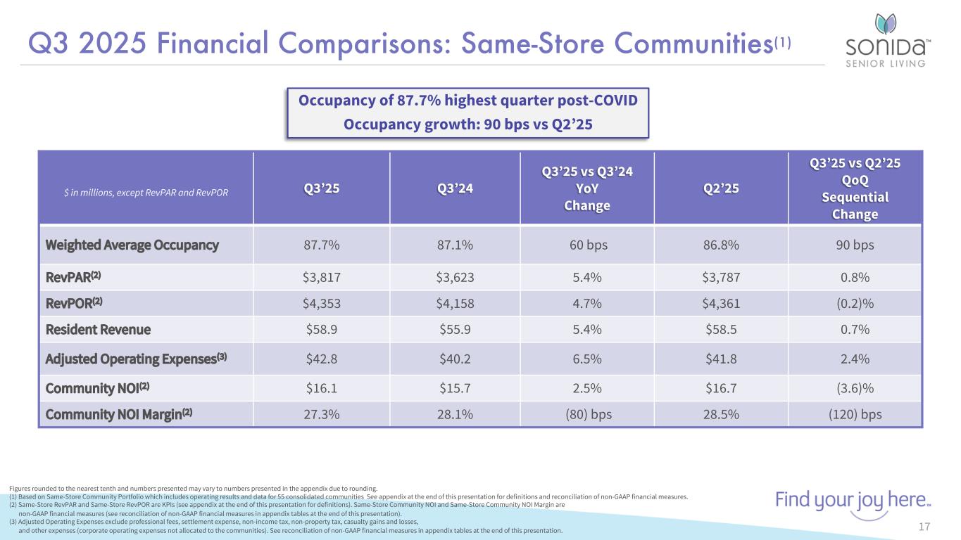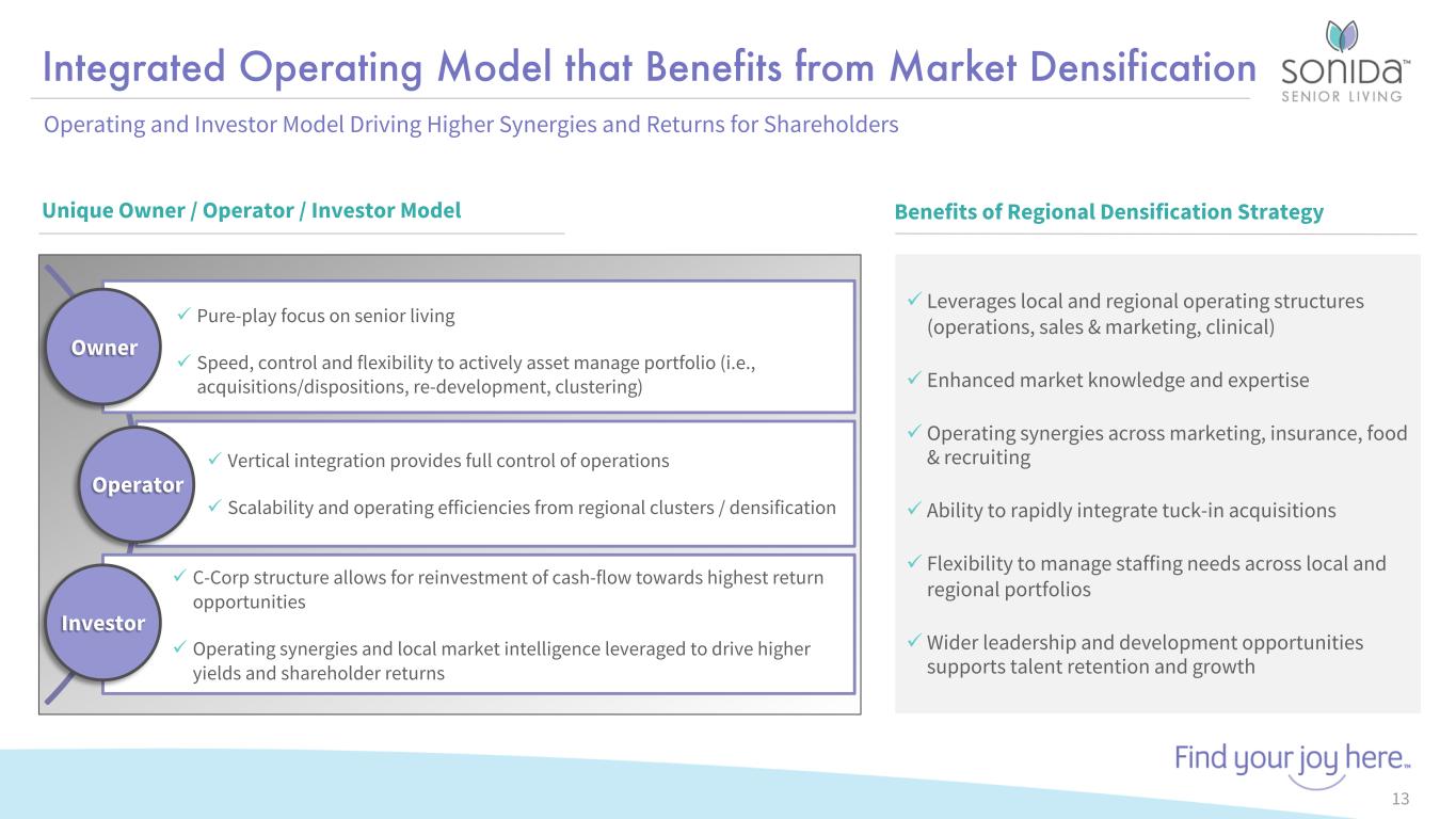 12 Recent Financial Highlights Same-Store Communities(4) Figures rounded to the nearest tenth and numbers presented may vary to numbers presented in the appendix due to rounding. (1) Reflects Sonida’s respective ownership share of certain acquisitions: Stone JV acquisition (32.71% ownership share) and Palatine JV acquisition (51% ownership share). (2) Community NOI, Community NOI Margin and Adjusted EBITDA are non-GAAP financial measures (see reconciliation of non-GAAP financial measures in appendix tables at the end of this presentation). (3) Community NOI Margin unfavorably impacted due to addition of Acquisition Communities at lower occupancy levels . (4) Same-Store Community Portfolio includes operating results and data for 55 consolidated communities. See appendix at the end of this presentation for definitions. (5) Excludes The Wellington at North Bend Crossing – Vista, December 31, 2024 acquisition in Cincinnati, OH, which was not in operation at closing. Community never opened due to foreclosure on the construction borrower but was opened by Sonida in July 2025. 2024 Acquisition Communities At-Share(1) Total Portfolio At-Share(1) Q3 2025 YoY Change • RevPOR: +9.6% • Community NOI(2): +20.7% • Community NOI Margin(2): (120) bps(3) • Adjusted EBITDA(2): +29.6% YTD 2025 YoY Change • RevPOR Growth: +10.0% • Community NOI(2): +25.5% • Community NOI Margin(2): (70) bps(3) • Adjusted EBITDA(2): +34.3% • RevPOR Growth: +4.7% • Community NOI(2): +2.5% • Community NOI Margin(2): (80) bps Q3 2025 YoY Change YTD 2025 YoY Change • RevPOR: +4.9% • Community NOI(2): +8.4% • Community NOI Margin(2): +60 bps Occupancy • Q3 Weighted Average: 87.7% / +60 bps • October Weighted Average: 88.0% • October 31 Spot: 89.0% Q3 2025 QoQ Sequential Change • Weighted Average Occupancy: +370 bps • Resident Revenue: +5.0% • Community NOI: +25.2% • Community NOI Margin: +470 bps YTD 2025 vs December 2024 (annualized) Change(5) • Weighted Average Occupancy: +210 bps • RevPOR: +4.8% • Community NOI: +96.4% • Community NOI Margin: +1,190 bps
