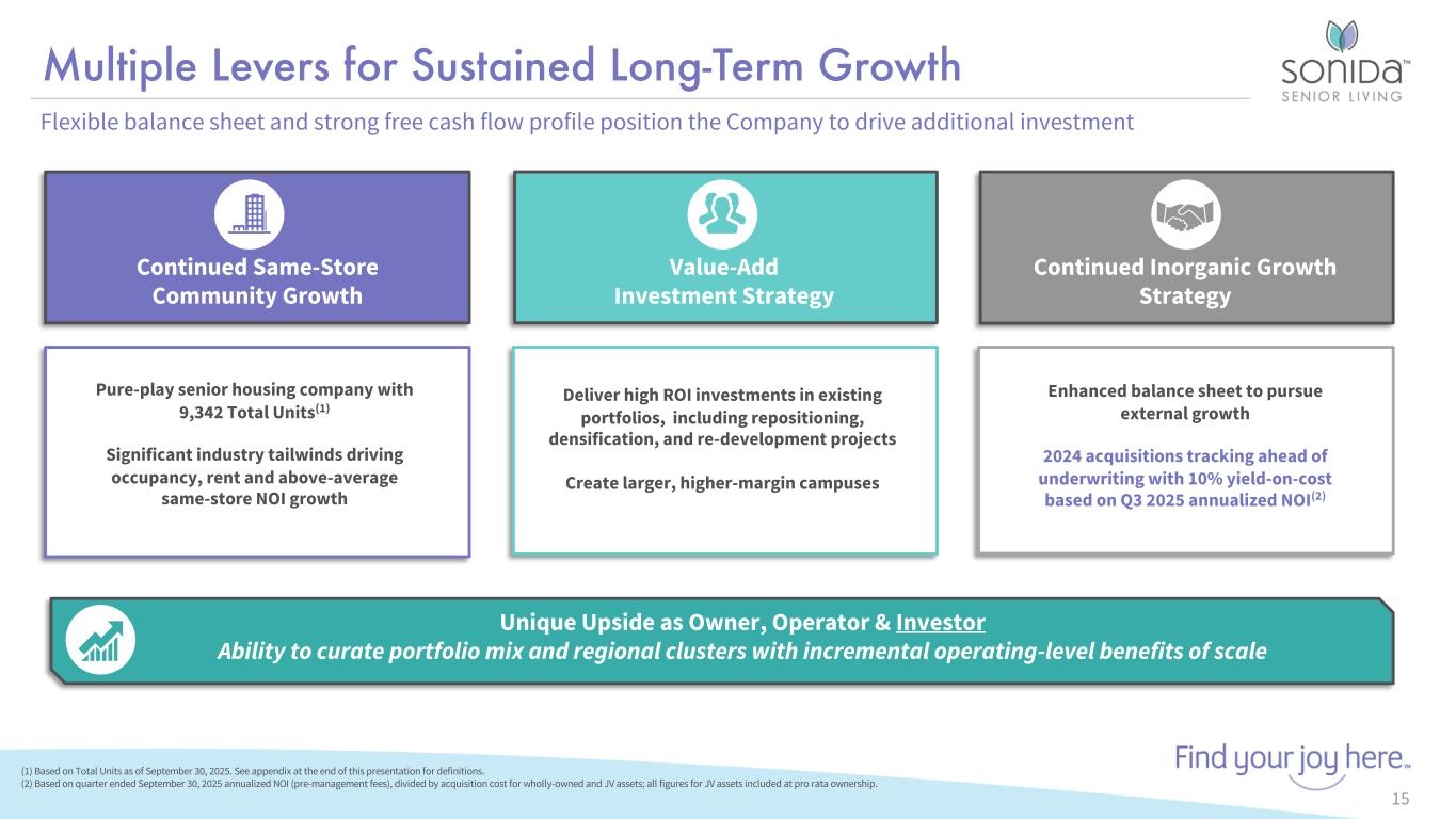 Evolution of Sonida 14 -Occupancy troughs at 75.0% and NOI Margin(1) troughs at (3.6)% -Conversant Capital leads $155M recapitalization -Debt modification with Fannie Mae, discounted loan purchases -$48M PIPE from largest shareholders -Occupancy, RevPOR, NOI, Margin growth on Same-Store Community portfolio -$130M overnight equity offering -$150M corporate credit facility -$296M of community acquisitions since 2024 -Announcement of CNL Healthcare Properties merger, which will create $3 billion pure-play senior housing owner- operator Goal-Driven Strategic Execution Covid Distress Recapitalization Balance Sheet Optimization Organic Growth Accelerated Inorganic Growth Pivot to Inorganic Growth Q1 2020+ Nov 2021 2022 – Q1 2024 2023+ 2024+ Nov 2025 (1) NOI Margin is a non-GAAP financial measure. See appendix at the end of this presentation for reconciliations of non-GAAP financial measures.