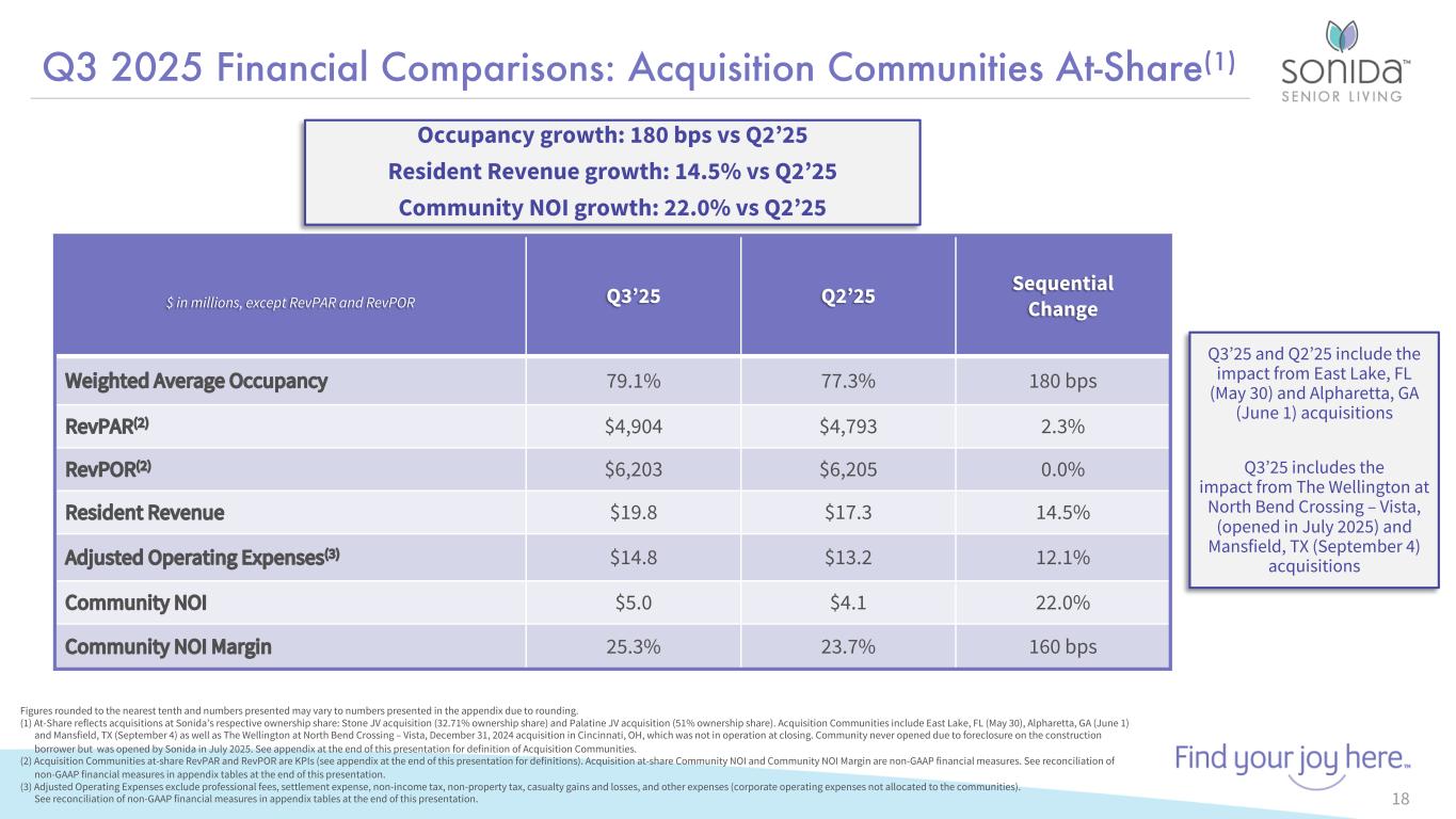Q3 2025 Financial Comparisons: Same-Store Communities(1) 17 Figures rounded to the nearest tenth and numbers presented may vary to numbers presented in the appendix due to rounding. (1) Based on Same-Store Community Portfolio which includes operating results and data for 55 consolidated communities See appendix at the end of this presentation for definitions and reconciliation of non-GAAP financial measures. (2) Same-Store RevPAR and Same-Store RevPOR are KPIs (see appendix at the end of this presentation for definitions). Same-Store Community NOI and Same-Store Community NOI Margin are non-GAAP financial measures (see reconciliation of non-GAAP financial measures in appendix tables at the end of this presentation). (3) Adjusted Operating Expenses exclude professional fees, settlement expense, non-income tax, non-property tax, casualty gains and losses, and other expenses (corporate operating expenses not allocated to the communities). See reconciliation of non-GAAP financial measures in appendix tables at the end of this presentation. Occupancy of 87.7% highest quarter post-COVID Occupancy growth: 90 bps vs Q2’25 $ in millions, except RevPAR and RevPOR Q3’25 Q3’24 Q3’25 vs Q3’24 YoY Change Q2’25 Q3’25 vs Q2’25 QoQ Sequential Change 87.7% 87.1% 60 bps 86.8% 90 bps $3,817 $3,623 5.4% $3,787 0.8% $4,353 $4,158 4.7% $4,361 (0.2)% $58.9 $55.9 5.4% $58.5 0.7% $42.8 $40.2 6.5% $41.8 2.4% $16.1 $15.7 2.5% $16.7 (3.6)% 27.3% 28.1% (80) bps 28.5% (120) bps
