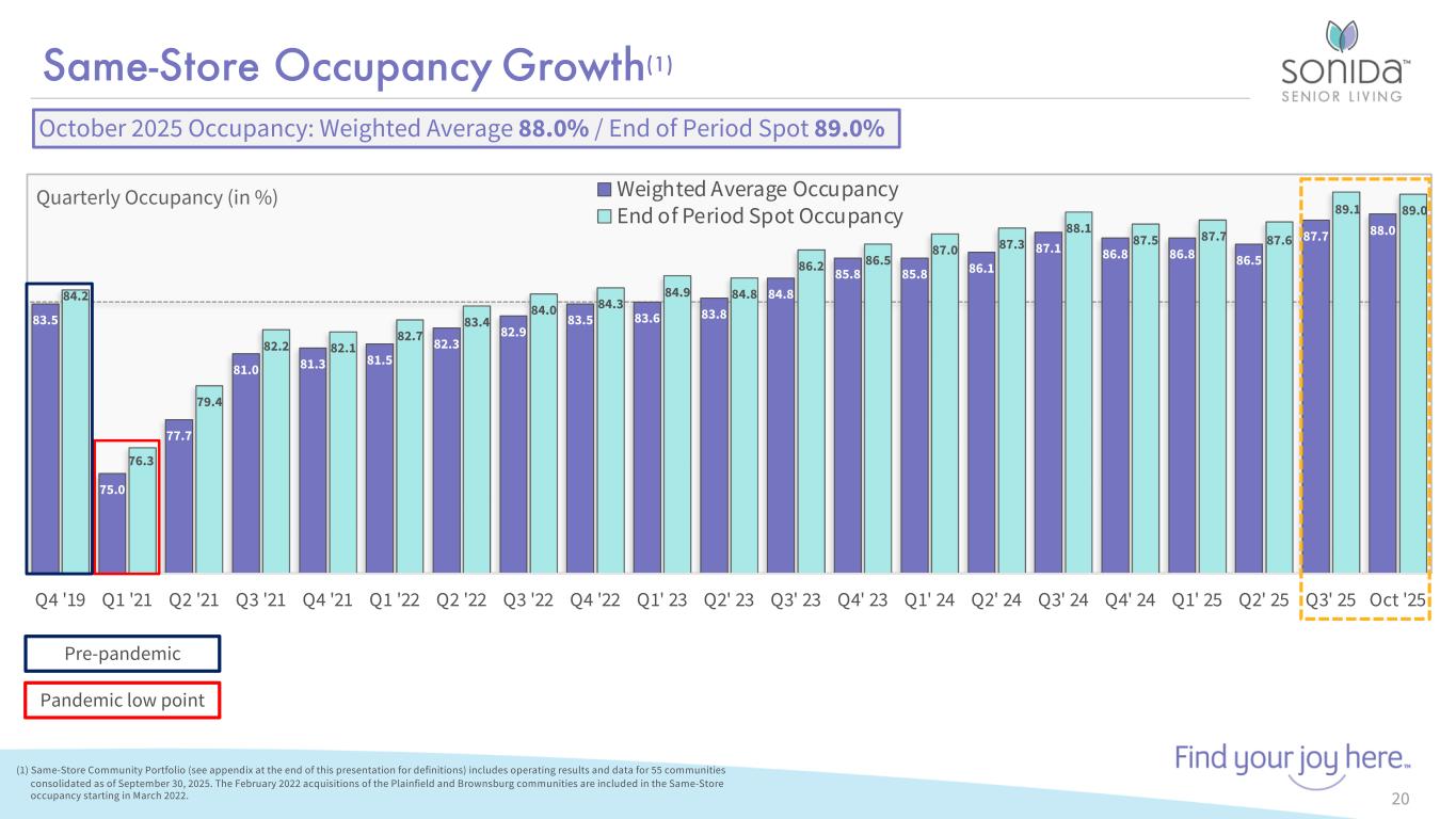 Q3 2025 Financial Comparisons: Acquisition Communities At-Share(1) 18 $ in millions, except RevPAR and RevPOR Q3’25 Q2’25 Sequential Change 79.1% 77.3% 180 bps $4,904 $4,793 2.3% $6,203 $6,205 0.0% $19.8 $17.3 14.5% $14.8 $13.2 12.1% $5.0 $4.1 22.0% 25.3% 23.7% 160 bps Figures rounded to the nearest tenth and numbers presented may vary to numbers presented in the appendix due to rounding. (1) At-Share reflects acquisitions at Sonida’s respective ownership share: Stone JV acquisition (32.71% ownership share) and Palatine JV acquisition (51% ownership share). Acquisition Communities include East Lake, FL (May 30), Alpharetta, GA (June 1) and Mansfield, TX (September 4) as well as The Wellington at North Bend Crossing – Vista, December 31, 2024 acquisition in Cincinnati, OH, which was not in operation at closing. Community never opened due to foreclosure on the construction borrower but was opened by Sonida in July 2025. See appendix at the end of this presentation for definition of Acquisition Communities. (2) Acquisition Communities at-share RevPAR and RevPOR are KPIs (see appendix at the end of this presentation for definitions). Acquisition at-share Community NOI and Community NOI Margin are non-GAAP financial measures. See reconciliation of non-GAAP financial measures in appendix tables at the end of this presentation. (3) Adjusted Operating Expenses exclude professional fees, settlement expense, non-income tax, non-property tax, casualty gains and losses, and other expenses (corporate operating expenses not allocated to the communities). See reconciliation of non-GAAP financial measures in appendix tables at the end of this presentation. Occupancy growth: 180 bps vs Q2’25 Resident Revenue growth: 14.5% vs Q2’25 Community NOI growth: 22.0% vs Q2’25 Q3’25 and Q2’25 include the impact from East Lake, FL (May 30) and Alpharetta, GA (June 1) acquisitions Q3’25 includes the impact from The Wellington at North Bend Crossing – Vista, (opened in July 2025) and Mansfield, TX (September 4) acquisitions