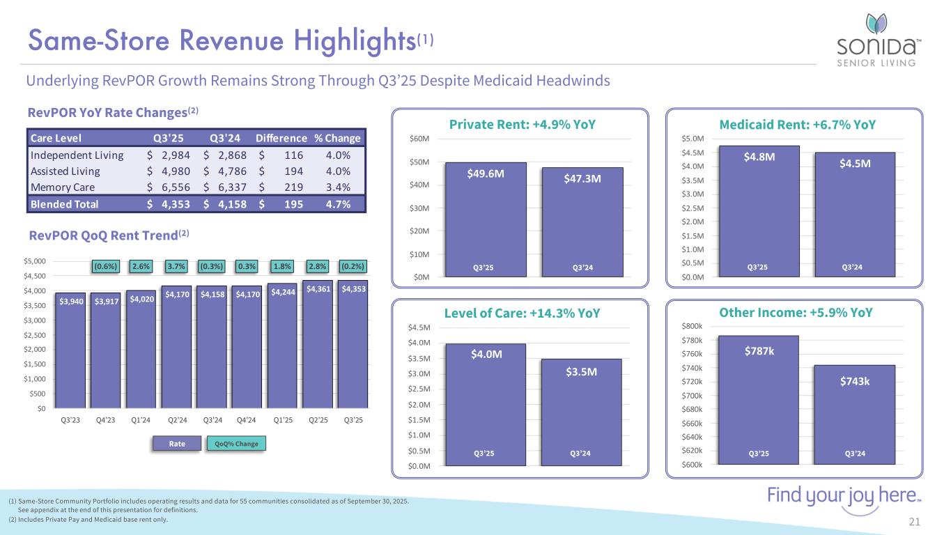 83.5 75.0 77.7 81.0 81.3 81.5 82.3 82.9 83.5 83.6 83.8 84.8 85.8 85.8 86.1 87.1 86.8 86.8 86.5 87.7 88.0 84.2 76.3 79.4 82.2 82.1 82.7 83.4 84.0 84.3 84.9 84.8 86.2 86.5 87.0 87.3 88.1 87.5 87.7 87.6 89.1 89.0 Q4 '19 Q1 '21 Q2 '21 Q3 '21 Q4 '21 Q1 '22 Q2 '22 Q3 '22 Q4 '22 Q1' 23 Q2' 23 Q3' 23 Q4' 23 Q1' 24 Q2' 24 Q3' 24 Q4' 24 Q1' 25 Q2' 25 Q3' 25 Oct '25 Weighted Average Occupancy End of Period Spot Occupancy Same-Store Occupancy Growth(1) 20 Quarterly Occupancy (in %) Pandemic low point (1) Same-Store Community Portfolio (see appendix at the end of this presentation for definitions) includes operating results and data for 55 communities consolidated as of September 30, 2025. The February 2022 acquisitions of the Plainfield and Brownsburg communities are included in the Same-Store occupancy starting in March 2022. Pre-pandemic October 2025 Occupancy: Weighted Average 88.0% / End of Period Spot 89.0%
