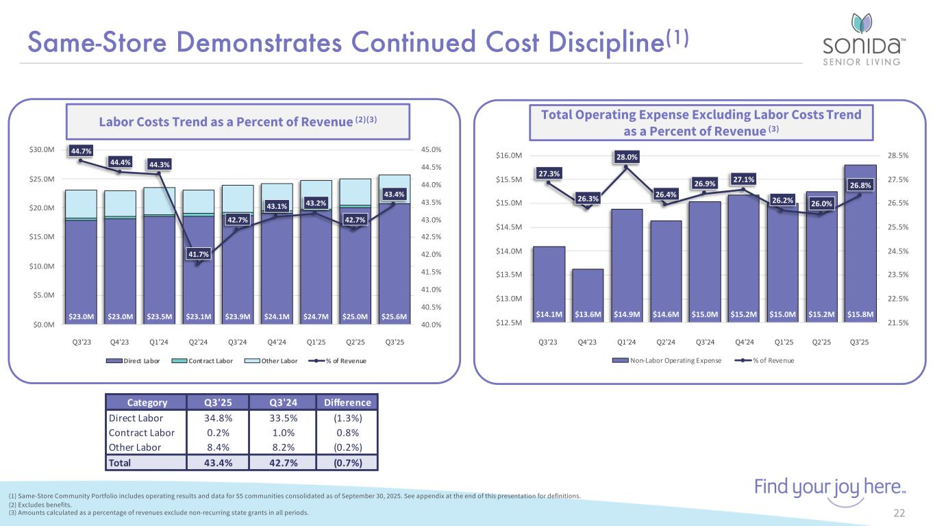 $787k $743k $600k $620k $640k $660k $680k $700k $720k $740k $760k $780k $800k $4.0M $3.5M $0.0M $0.5M $1.0M $1.5M $2.0M $2.5M $3.0M $3.5M $4.0M $4.5M $4.8M $4.5M $0.0M $0.5M $1.0M $1.5M $2.0M $2.5M $3.0M $3.5M $4.0M $4.5M $5.0M $49.6M $47.3M $0M $10M $20M $30M $40M $50M $60M Same-Store Revenue Highlights(1) (2) Includes Private Pay and Medicaid base rent only. (1) Same-Store Community Portfolio includes operating results and data for 55 communities consolidated as of September 30, 2025. See appendix at the end of this presentation for definitions. Underlying RevPOR Growth Remains Strong Through Q3’25 Despite Medicaid Headwinds RevPOR YoY Rate Changes(2) RevPOR QoQ Rent Trend(2) QoQ% ChangeRate Q3’25 Q3’24 Private Rent: +4.9% YoY Medicaid Rent: +6.7% YoY Q3’25 Q3’24 Level of Care: +14.3% YoY Q3’25 Q3’24 Other Income: +5.9% YoY Q3’25 Q3’24 $3,940 $3,917 $4,020 $4,170 $4,158 $4,170 $4,244 $4,361 $4,353 (0.6%) 2.6% 3.7% (0.3%) 0.3% 1.8% 2.8% (0.2%) $0 $500 $1,000 $1,500 $2,000 $2,500 $3,000 $3,500 $4,000 $4,500 $5,000 09/ 202 3 12/ 202 3 03/ 202 4 06/ 202 4 09/ 202 4 12/ 202 4 03/ 202 5 06/ 202 5 09/ 202 5Q3’23 Q4’23 Q1’24 Q2’24 Q3’24 Q4’24 Q1’25 Q2’25 Q3’25 Care Level Q3'25 Q3'24 Difference % Change Independent Living 2,984$ 2,868$ 116$ 4.0% Assisted Living 4,980$ 4,786$ 194$ 4.0% Memory Care 6,556$ 6,337$ 219$ 3.4% Blended Total 4,353$ 4,158$ 195$ 4.7% 21
