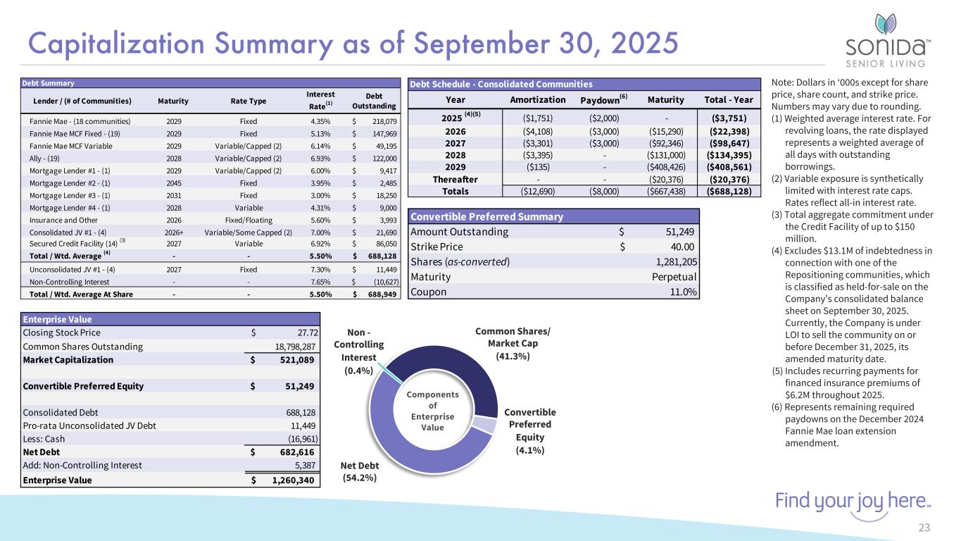 $14.1M $13.6M $14.9M $14.6M $15.0M $15.2M $15.0M $15.2M $15.8M 27.3% 26.3% 28.0% 26.4% 26.9% 27.1% 26.2% 26.0% 26.8% 21.5% 22.5% 23.5% 24.5% 25.5% 26.5% 27.5% 28.5% $12.5M $13.0M $13.5M $14.0M $14.5M $15.0M $15.5M $16.0M 09/ 202 3 12/ 202 3 03/ 202 4 06/ 202 4 09/ 202 4 12/ 202 4 03/ 202 5 06/ 202 5 09/ 202 5 Non-Labor Operating Expense % of Revenue Same-Store Demonstrates Continued Cost Discipline(1) 22 (1) Same-Store Community Portfolio includes operating results and data for 55 communities consolidated as of September 30, 2025. See appendix at the end of this presentation for definitions. (2) Excludes benefits. (3) Amounts calculated as a percentage of revenues exclude non-recurring state grants in all periods. Total Operating Expense Excluding Labor Costs Trend as a Percent of Revenue (3) Q3’23 Q4’23 Q1’24 Q2’24 Q3’24 Q4’24 Q1’25 Q2’25 Q3’25 $23.0M $23.0M $23.5M $23.1M $23.9M $24.1M $24.7M $25.0M $25.6M 44.7% 44.4% 44.3% 41.7% 42.7% 43.1% 43.2% 42.7% 43.4% 40.0% 40.5% 41.0% 41.5% 42.0% 42.5% 43.0% 43.5% 44.0% 44.5% 45.0% $0.0M $5.0M $10.0M $15.0M $20.0M $25.0M $30.0M 09/2023 12/2023 03/2024 06/2024 09/2024 12/2024 03/2025 06/2025 09/2025 Direct Labor Contract Labor Other Labor % of Revenue Labor Costs Trend as a Percent of Revenue (2)(3) Q3’23 Q4’23 Q1’24 Q2’24 Q3’24 Q4’24 Q1’25 Q2’25 Q3’25 Category Q3'25 Q3'24 Difference Direct Labor 34.8% 33.5% (1.3%) Contract Labor 0.2% 1.0% 0.8% Other Labor 8.4% 8.2% (0.2%) Total 43.4% 42.7% (0.7%)