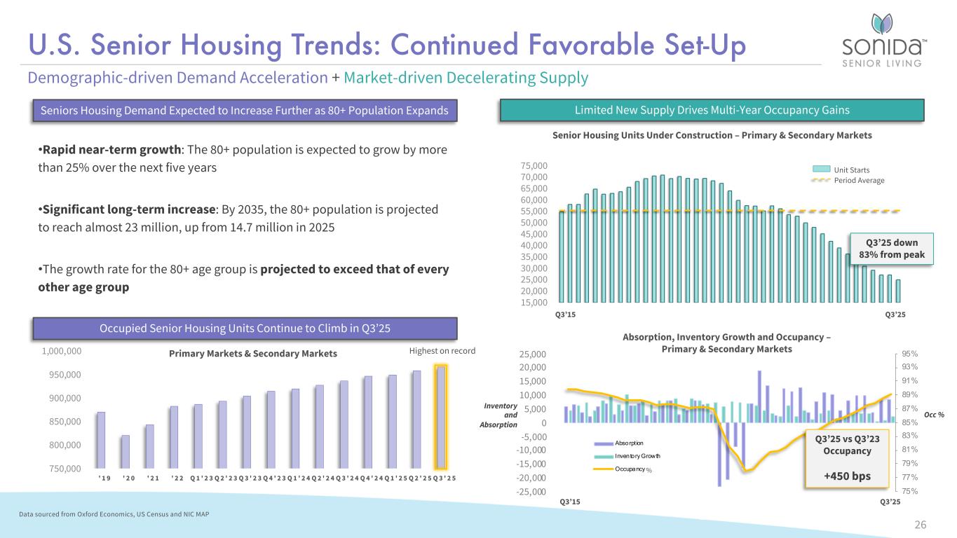Primed to Pursue Compelling Inorganic Growth Opportunity 25 Sonida is a Differentiated Acquiror Amidst Market Dislocation, Advantageously Combining Characteristics of Both REITs and Operators Opportune Time to Consolidate a Dislocated Market Anticipated Beginning of Multi-Year Senior Housing Recovery Favorable industry tailwinds (aging population and low supply) expected to drive positive net absorption going forward Distressed Capital Structures Overleveraged capital structures coupled with more conservative underwriting from lenders creates a significant opportunity for a well-capitalized buyer Few Institutional Operators Many operators are poorly capitalized to invest in platforms that support both scale and operational excellence Full Control of Operations ü Willing and able to turnaround distressed situations ü Access to real-time data to aid investment decisions Sonida is A Differentiated Acquiror Creative Ways to Finance Acquisitions ü Can tailor investment structures depending on deal profile across wide range of instruments Financing Capabilities ü Excellent relationships with lenders ü Strong liquidity and corporate credit facility of $150M Operating Model ü Operating model unlocks greater asset performance through economies of scale synergies Deal Networking ü Local / regional teams cultivate relationships for off-market deals Sonida has acquired 23 Communities (eight through JVs) representing 1,960 Units(1) since 2024 (1) Based on Total Units as of September 30, 2025. See appendix at the end of this presentation for definitions.