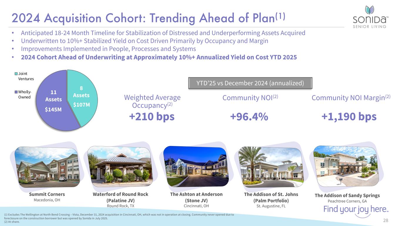 September 2025 Acquisition 27 • Acquired High-Quality and Newer Vintage Senior Housing Community Located in Dallas-Fort Worth Submarket for $15.5M • Brings Sonida’s DFW Total Portfolio to 9 Assets and 21 Total in Texas 62 Assisted Living Managed Owned 98 Total Units 36 Memory Care ~$159,000 Per Unit Purchase Price 2016 Construction Completed Potential Double-Digit Yield Upon Stabilization Cedar Bluff AL & MC – Mansfield, TX Property is situated in strong corridor sharing a driveway with senior- centric healthcare providers and referral sources such as a kidney dialysis center, renal care, orthopedic specialists, and GI specialists and sits immediately across the street from a 294-bed hospital. Mansfield, TX DallasFort Worth New Acquisition