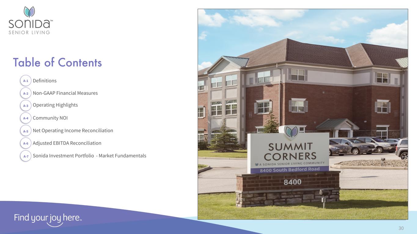 A-1 Operating Highlights A-2 Community NOI A-3 Net Operating Income Reconciliation A-4 Adjusted EBITDA Reconciliation A-5 Table of Contents Sonida Investment Portfolio - Market Fundamentals Definitions A-6 Non-GAAP Financial Measures 30 A-7
