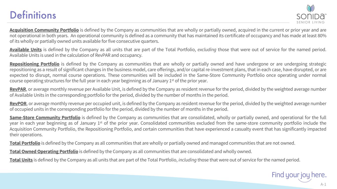Definitions A-1 Acquisition Community Portfolio is defined by the Company as communities that are wholly or partially owned, acquired in the current or prior year and are not operational in both years. An operational community is defined as a community that has maintained its certificate of occupancy and has made at least 80% of its wholly or partially owned units available for five consecutive quarters. Available Units is defined by the Company as all units that are part of the Total Portfolio, excluding those that were out of service for the named period. Available Units is used in the calculation of RevPAR and occupancy. Repositioning Portfolio is defined by the Company as communities that are wholly or partially owned and have undergone or are undergoing strategic repositioning as a result of significant changes in the business model, care offerings, and/or capital re-investment plans, that in each case, have disrupted, or are expected to disrupt, normal course operations. These communities will be included in the Same-Store Community Portfolio once operating under normal course operating structures for the full year in each year beginning as of January 1st of the prior year. RevPAR, or average monthly revenue per Available Unit, is defined by the Company as resident revenue for the period, divided by the weighted average number of Available Units in the corresponding portfolio for the period, divided by the number of months in the period. RevPOR, or average monthly revenue per occupied unit, is defined by the Company as resident revenue for the period, divided by the weighted average number of occupied units in the corresponding portfolio for the period, divided by the number of months in the period. Same-Store Community Portfolio is defined by the Company as communities that are consolidated, wholly or partially owned, and operational for the full year in each year beginning as of January 1st of the prior year. Consolidated communities excluded from the same-store community portfolio include the Acquisition Community Portfolio, the Repositioning Portfolio, and certain communities that have experienced a casualty event that has significantly impacted their operations. Total Portfolio is defined by the Company as all communities that are wholly or partially owned and managed communities that are not owned. Total Owned Operating Portfolio is defined by the Company as all communities that are consolidated and wholly owned. Total Units is defined by the Company as all units that are part of the Total Portfolio, including those that were out of service for the named period.