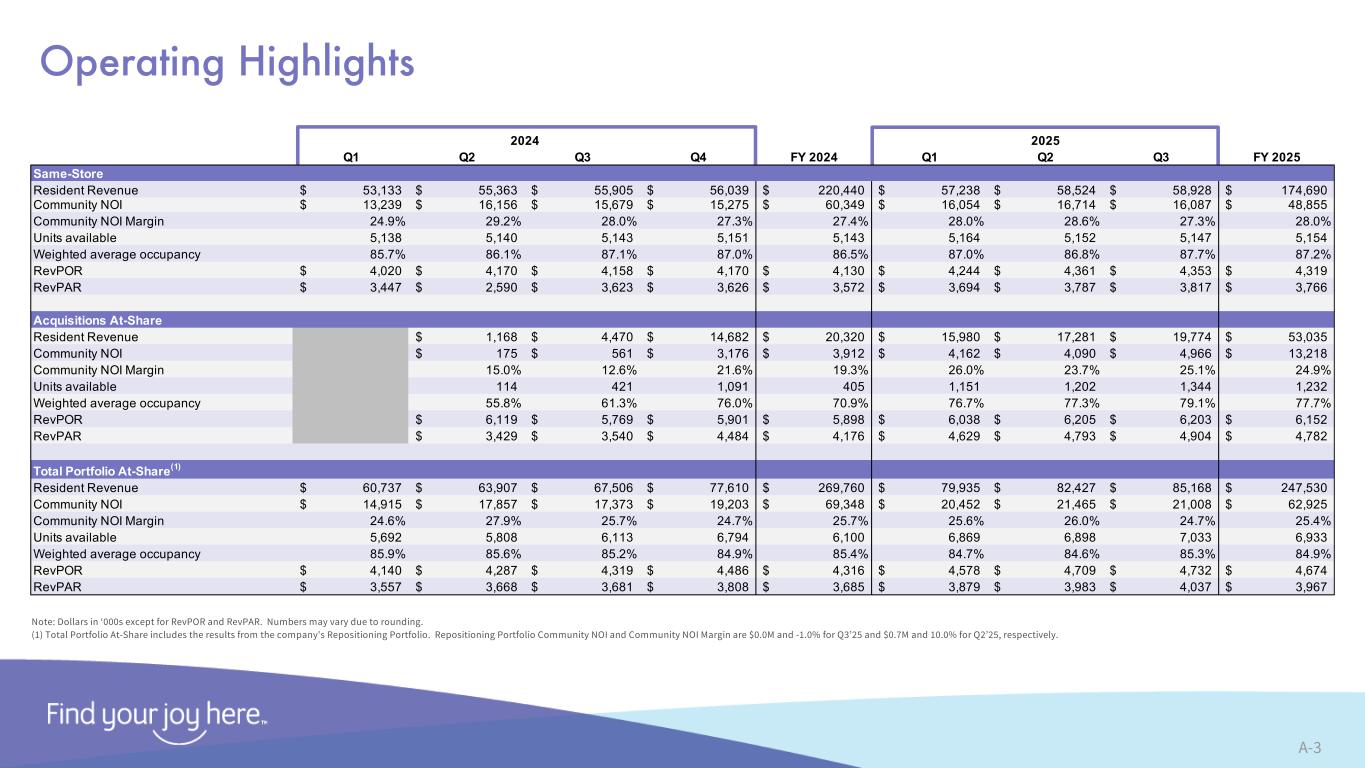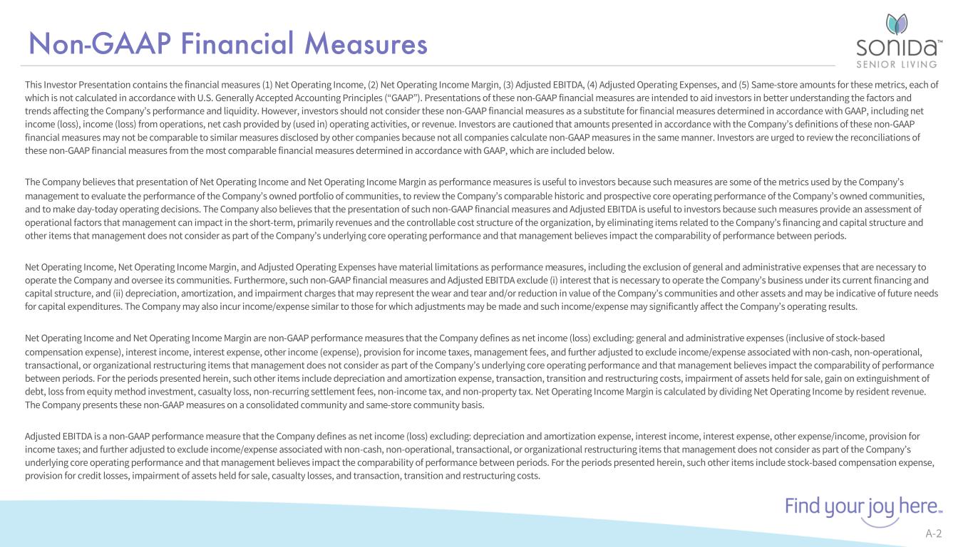 Non-GAAP Financial Measures A-2 This Investor Presentation contains the financial measures (1) Net Operating Income, (2) Net Operating Income Margin, (3) Adjusted EBITDA, (4) Adjusted Operating Expenses, and (5) Same-store amounts for these metrics, each of which is not calculated in accordance with U.S. Generally Accepted Accounting Principles (“GAAP”). Presentations of these non-GAAP financial measures are intended to aid investors in better understanding the factors and trends affecting the Company’s performance and liquidity. However, investors should not consider these non-GAAP financial measures as a substitute for financial measures determined in accordance with GAAP, including net income (loss), income (loss) from operations, net cash provided by (used in) operating activities, or revenue. Investors are cautioned that amounts presented in accordance with the Company’s definitions of these non-GAAP financial measures may not be comparable to similar measures disclosed by other companies because not all companies calculate non-GAAP measures in the same manner. Investors are urged to review the reconciliations of these non-GAAP financial measures from the most comparable financial measures determined in accordance with GAAP, which are included below. The Company believes that presentation of Net Operating Income and Net Operating Income Margin as performance measures is useful to investors because such measures are some of the metrics used by the Company’s management to evaluate the performance of the Company’s owned portfolio of communities, to review the Company’s comparable historic and prospective core operating performance of the Company’s owned communities, and to make day-today operating decisions. The Company also believes that the presentation of such non-GAAP financial measures and Adjusted EBITDA is useful to investors because such measures provide an assessment of operational factors that management can impact in the short-term, primarily revenues and the controllable cost structure of the organization, by eliminating items related to the Company’s financing and capital structure and other items that management does not consider as part of the Company’s underlying core operating performance and that management believes impact the comparability of performance between periods. Net Operating Income, Net Operating Income Margin, and Adjusted Operating Expenses have material limitations as performance measures, including the exclusion of general and administrative expenses that are necessary to operate the Company and oversee its communities. Furthermore, such non-GAAP financial measures and Adjusted EBITDA exclude (i) interest that is necessary to operate the Company’s business under its current financing and capital structure, and (ii) depreciation, amortization, and impairment charges that may represent the wear and tear and/or reduction in value of the Company’s communities and other assets and may be indicative of future needs for capital expenditures. The Company may also incur income/expense similar to those for which adjustments may be made and such income/expense may significantly affect the Company’s operating results. Net Operating Income and Net Operating Income Margin are non-GAAP performance measures that the Company defines as net income (loss) excluding: general and administrative expenses (inclusive of stock-based compensation expense), interest income, interest expense, other income (expense), provision for income taxes, management fees, and further adjusted to exclude income/expense associated with non-cash, non-operational, transactional, or organizational restructuring items that management does not consider as part of the Company’s underlying core operating performance and that management believes impact the comparability of performance between periods. For the periods presented herein, such other items include depreciation and amortization expense, transaction, transition and restructuring costs, impairment of assets held for sale, gain on extinguishment of debt, loss from equity method investment, casualty loss, non-recurring settlement fees, non-income tax, and non-property tax. Net Operating Income Margin is calculated by dividing Net Operating Income by resident revenue. The Company presents these non-GAAP measures on a consolidated community and same-store community basis. Adjusted EBITDA is a non-GAAP performance measure that the Company defines as net income (loss) excluding: depreciation and amortization expense, interest income, interest expense, other expense/income, provision for income taxes; and further adjusted to exclude income/expense associated with non-cash, non-operational, transactional, or organizational restructuring items that management does not consider as part of the Company’s underlying core operating performance and that management believes impact the comparability of performance between periods. For the periods presented herein, such other items include stock-based compensation expense, provision for credit losses, impairment of assets held for sale, casualty losses, and transaction, transition and restructuring costs.