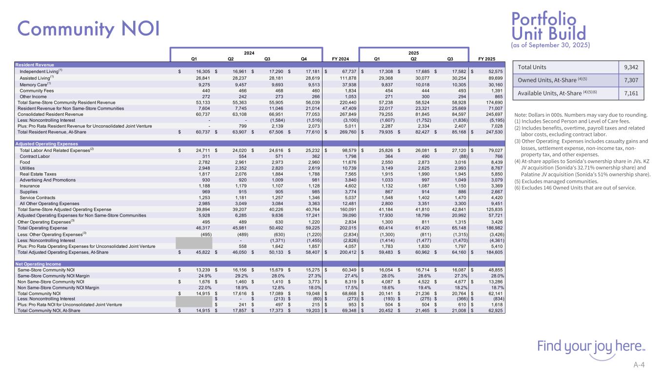 Operating Highlights A-3 Note: Dollars in ‘000s except for RevPOR and RevPAR. Numbers may vary due to rounding. (1) Total Portfolio At-Share includes the results from the company's Repositioning Portfolio. Repositioning Portfolio Community NOI and Community NOI Margin are $0.0M and -1.0% for Q3’25 and $0.7M and 10.0% for Q2’25, respectively. 2024 Q1 Q2 Q3 Q4 FY 2024 Q1 Q2 Q3 FY 2025 Same-Store Resident Revenue 53,133$ 55,363$ 55,905$ 56,039$ 220,440$ 57,238$ 58,524$ 58,928$ 174,690$ Community NOI 13,239$ 16,156$ 15,679$ 15,275$ 60,349$ 16,054$ 16,714$ 16,087$ 48,855$ Community NOI Margin 24.9% 29.2% 28.0% 27.3% 27.4% 28.0% 28.6% 27.3% 28.0% Units available 5,138 5,140 5,143 5,151 5,143 5,164 5,152 5,147 5,154 Weighted average occupancy 85.7% 86.1% 87.1% 87.0% 86.5% 87.0% 86.8% 87.7% 87.2% RevPOR 4,020$ 4,170$ 4,158$ 4,170$ 4,130$ 4,244$ 4,361$ 4,353$ 4,319$ RevPAR 3,447$ 2,590$ 3,623$ 3,626$ 3,572$ 3,694$ 3,787$ 3,817$ 3,766$ Acquisitions At-Share Resident Revenue 1,168$ 4,470$ 14,682$ 20,320$ 15,980$ 17,281$ 19,774$ 53,035$ Community NOI 175$ 561$ 3,176$ 3,912$ 4,162$ 4,090$ 4,966$ 13,218$ Community NOI Margin 15.0% 12.6% 21.6% 19.3% 26.0% 23.7% 25.1% 24.9% Units available 114 421 1,091 405 1,151 1,202 1,344 1,232 Weighted average occupancy 55.8% 61.3% 76.0% 70.9% 76.7% 77.3% 79.1% 77.7% RevPOR 6,119$ 5,769$ 5,901$ 5,898$ 6,038$ 6,205$ 6,203$ 6,152$ RevPAR 3,429$ 3,540$ 4,484$ 4,176$ 4,629$ 4,793$ 4,904$ 4,782$ Total Portfolio At-Share(1) Resident Revenue 60,737$ 63,907$ 67,506$ 77,610$ 269,760$ 79,935$ 82,427$ 85,168$ 247,530$ Community NOI 14,915$ 17,857$ 17,373$ 19,203$ 69,348$ 20,452$ 21,465$ 21,008$ 62,925$ Community NOI Margin 24.6% 27.9% 25.7% 24.7% 25.7% 25.6% 26.0% 24.7% 25.4% Units available 5,692 5,808 6,113 6,794 6,100 6,869 6,898 7,033 6,933 Weighted average occupancy 85.9% 85.6% 85.2% 84.9% 85.4% 84.7% 84.6% 85.3% 84.9% RevPOR 4,140$ 4,287$ 4,319$ 4,486$ 4,316$ 4,578$ 4,709$ 4,732$ 4,674$ RevPAR 3,557$ 3,668$ 3,681$ 3,808$ 3,685$ 3,879$ 3,983$ 4,037$ 3,967$ 2025