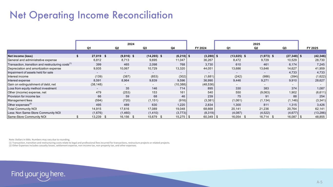 Net Operating Income Reconciliation A-5 Note: Dollars in 000s. Numbers may vary due to rounding. (1) Transaction, transition and restructuring costs relate to legal and professional fees incurred for transactions, restructure projects or related projects. (2) Other Expenses includes casualty losses, settlement expense, non-income tax, non-property tax, and other expenses. 2024 Q1 Q2 Q3 Q4 FY 2024 Q1 Q2 Q3 FY 2025 Net income (loss) 27,019$ (9,816)$ (14,265)$ (6,218)$ (3,280)$ (13,025)$ (1,973)$ (27,348)$ (42,346)$ General and administrative expense 6,812 8,713 9,695 11,047 36,267 8,472 9,729 10,529 28,730 Transaction, transition and restructuring costs(1) 399 465 2,098 768 3,730 610 461 6,174 7,245 Depreciation and amortization expense 9,935 10,067 10,729 13,320 44,051 13,686 13,646 14,627 41,959 Impairment of assets held for sale - - - - - - - 4,733 4,733 Interest income (139) (387) (853) (302) (1,681) (242) (986) (394) (1,622) Interest expense 8,591 8,964 9,839 9,596 36,990 9,446 9,271 9,910 28,627 Gain on extinguishment of debt, net (38,148) - - (10,388) (48,536) - - - - Loss from equity method investment - 35 146 714 895 330 383 374 1,087 Other (income) expense, net 479 (253) 153 161 540 550 (9,063) 1,902 (6,611) Provision for income tax 66 59 68 46 239 75 91 88 254 Management fees (594) (720) (1,151) (916) (3,381) (1,061) (1,134) (1,146) (3,341) Other expenses(2) 495 489 630 1,220 2,834 1,300 811 1,315 3,426 Total Community NOI 14,915 17,616 17,089 19,048 68,668 20,141 21,236 20,764 62,141 Less: Non Same-Store Community NOI (1,676) (1,460) (1,410) (3,773) (8,319) (4,087) (4,522) (4,677) (13,286) Same-Store Community NOI 13,239$ 16,156$ 15,679$ 15,275$ 60,349$ 16,054$ 16,714$ 16,087$ 48,855$ 2025
