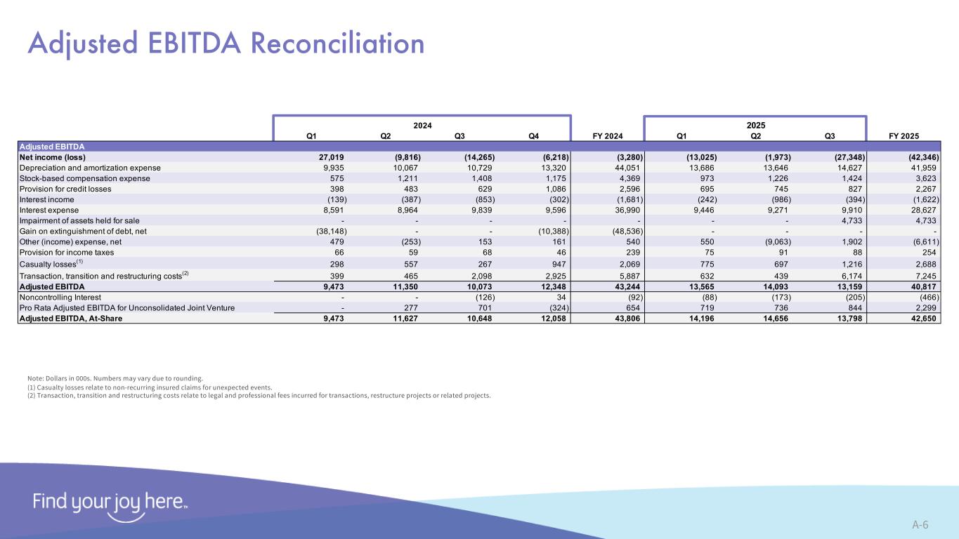 Adjusted EBITDA Reconciliation A-6 Note: Dollars in 000s. Numbers may vary due to rounding. (1) Casualty losses relate to non-recurring insured claims for unexpected events. (2) Transaction, transition and restructuring costs relate to legal and professional fees incurred for transactions, restructure projects or related projects. 2024 Q1 Q2 Q3 Q4 FY 2024 Q1 Q2 Q3 FY 2025 Adjusted EBITDA Net income (loss) 27,019 (9,816) (14,265) (6,218) (3,280) (13,025) (1,973) (27,348) (42,346) Depreciation and amortization expense 9,935 10,067 10,729 13,320 44,051 13,686 13,646 14,627 41,959 Stock-based compensation expense 575 1,211 1,408 1,175 4,369 973 1,226 1,424 3,623 Provision for credit losses 398 483 629 1,086 2,596 695 745 827 2,267 Interest income (139) (387) (853) (302) (1,681) (242) (986) (394) (1,622) Interest expense 8,591 8,964 9,839 9,596 36,990 9,446 9,271 9,910 28,627 Impairment of assets held for sale - - - - - - - 4,733 4,733 Gain on extinguishment of debt, net (38,148) - - (10,388) (48,536) - - - - Other (income) expense, net 479 (253) 153 161 540 550 (9,063) 1,902 (6,611) Provision for income taxes 66 59 68 46 239 75 91 88 254 Casualty losses(1) 298 557 267 947 2,069 775 697 1,216 2,688 Transaction, transition and restructuring costs(2) 399 465 2,098 2,925 5,887 632 439 6,174 7,245 Adjusted EBITDA 9,473 11,350 10,073 12,348 43,244 13,565 14,093 13,159 40,817 Noncontrolling Interest - - (126) 34 (92) (88) (173) (205) (466) Pro Rata Adjusted EBITDA for Unconsolidated Joint Venture - 277 701 (324) 654 719 736 844 2,299 Adjusted EBITDA, At-Share 9,473 11,627 10,648 12,058 43,806 14,196 14,656 13,798 42,650 2025