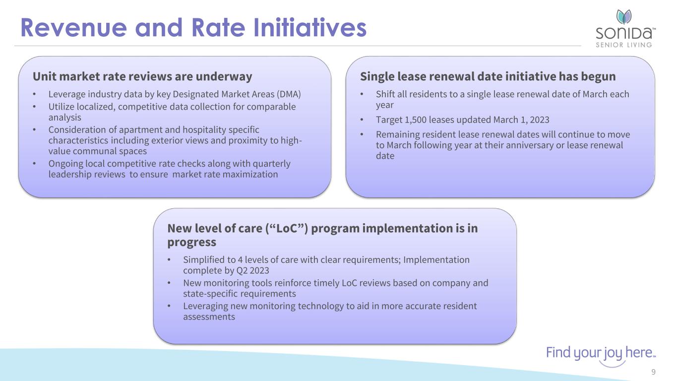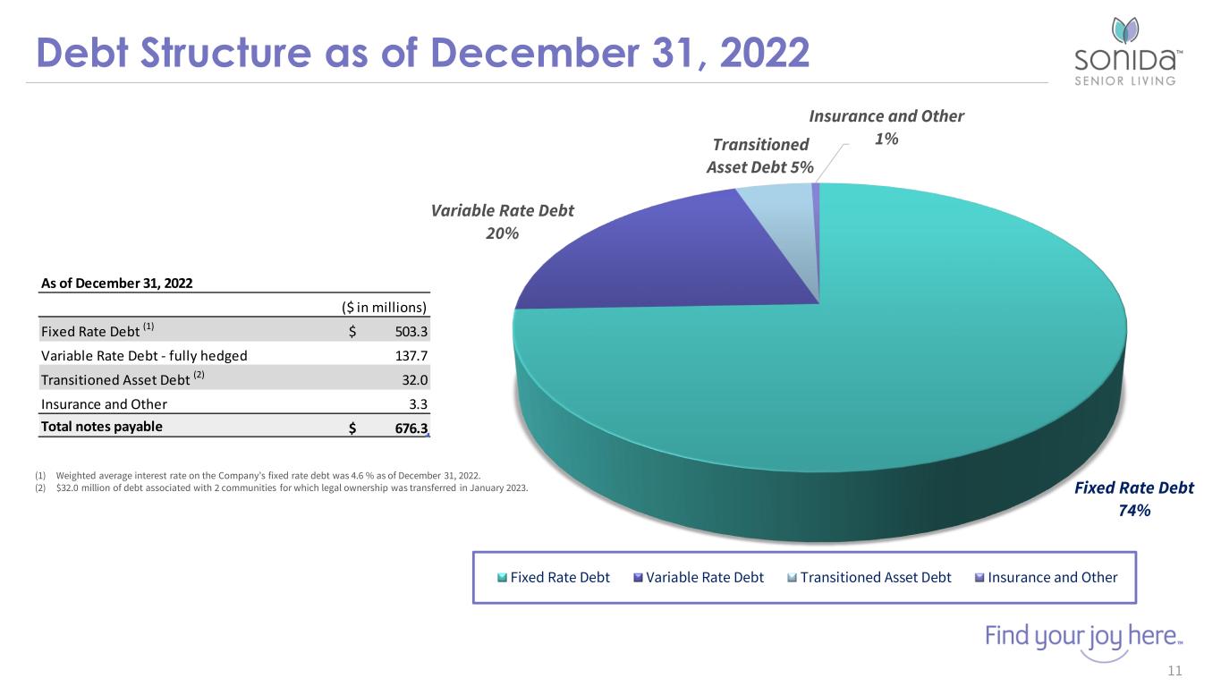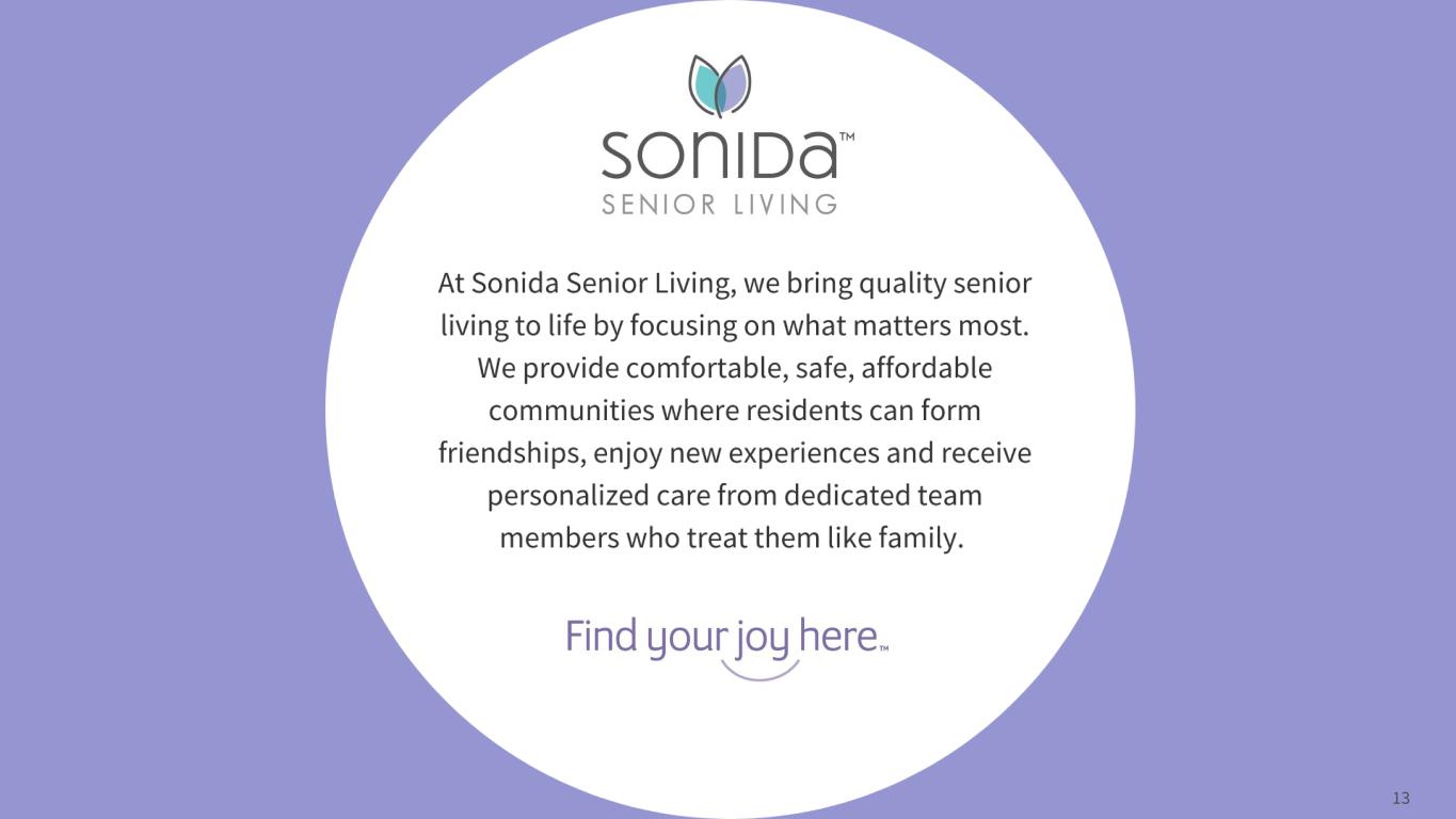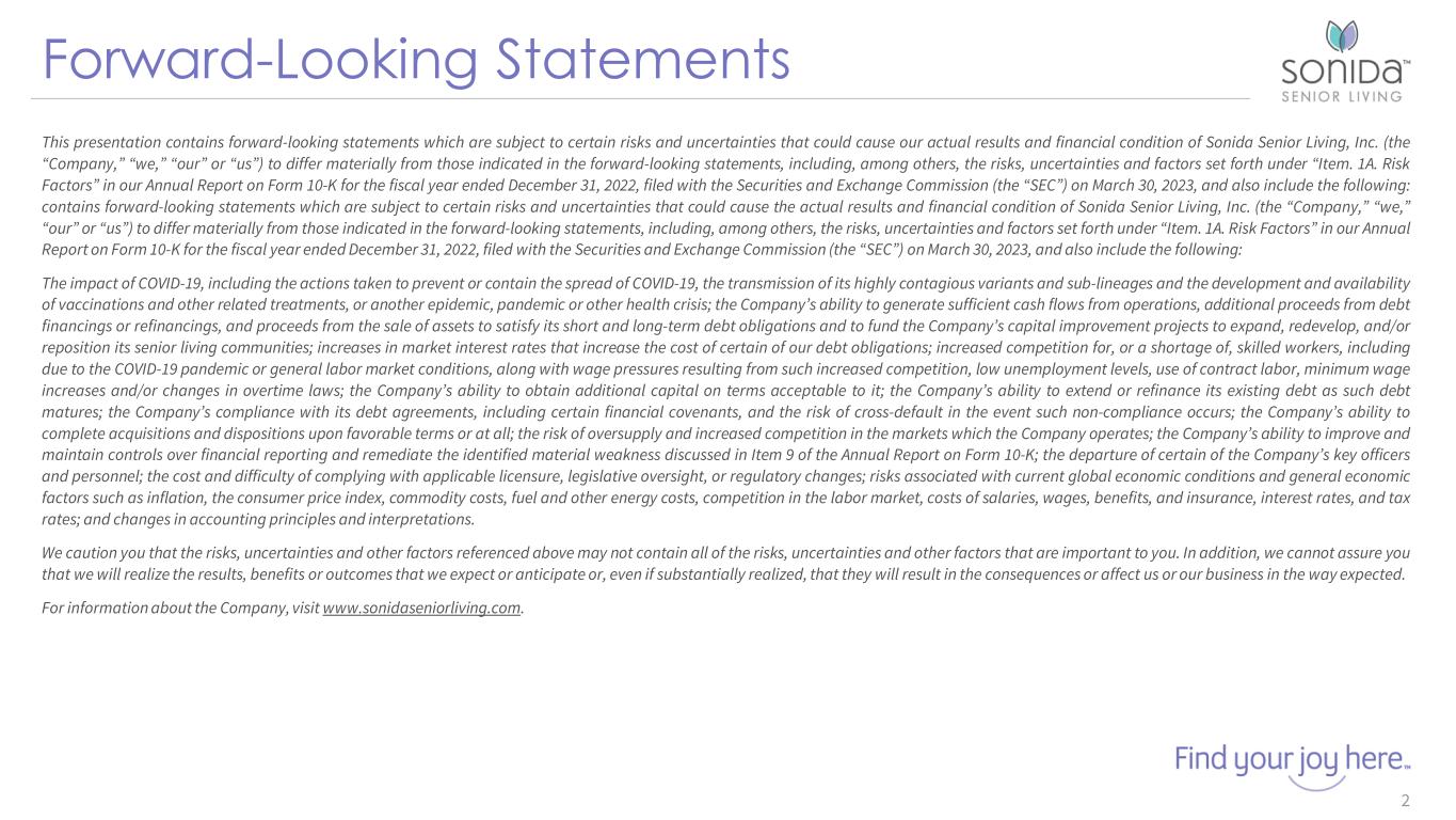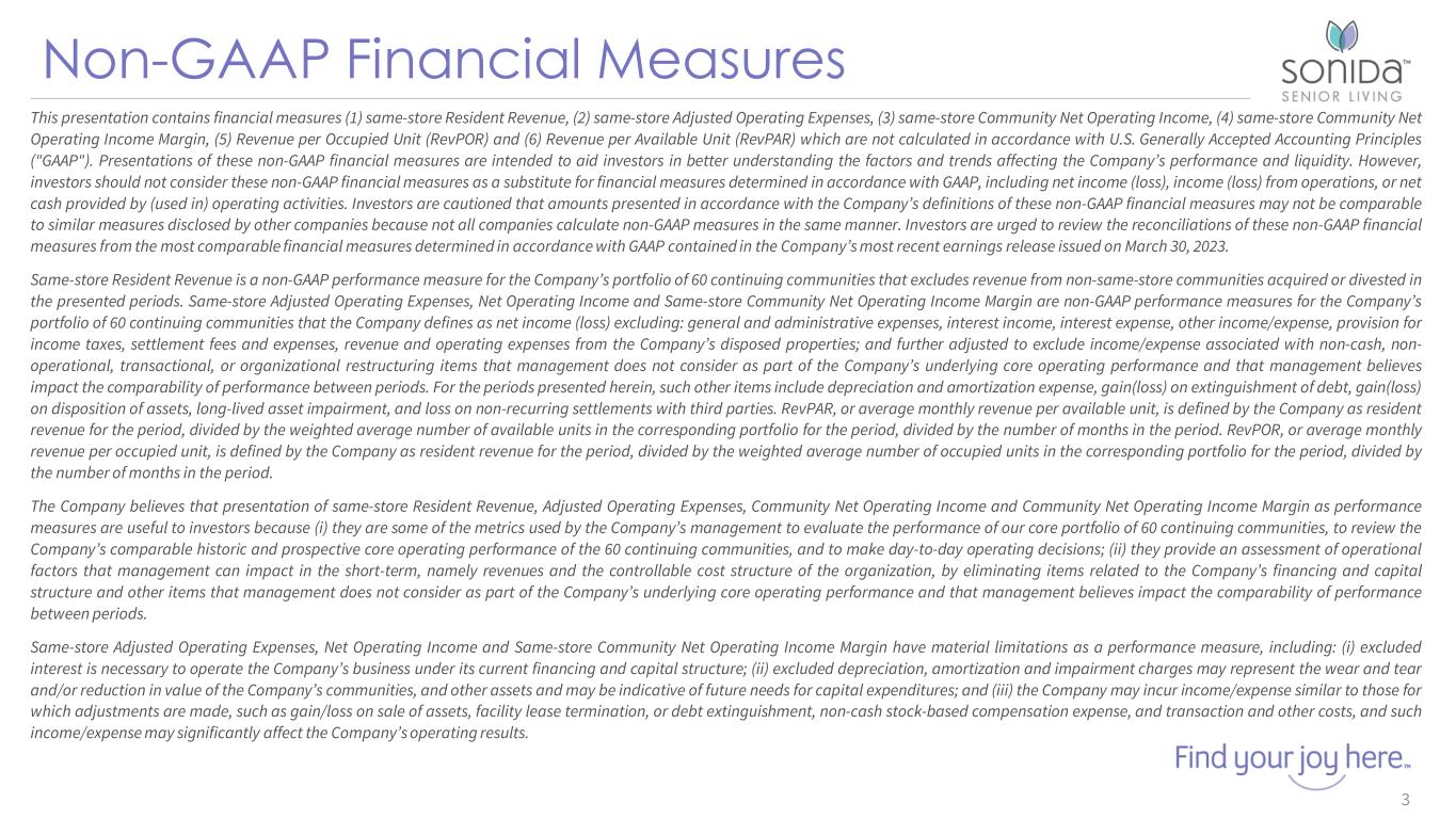Forward-Looking Statements 2 This presentation contains forward-looking statements which are subject to certain risks and uncertainties that could cause our actual results and financial condition of Sonida Senior Living, Inc. (the “Company,” “we,” “our” or “us”) to differ materially from those indicated in the forward-looking statements, including, among others, the risks, uncertainties and factors set forth under “Item. 1A. Risk Factors” in our Annual Report on Form 10-K for the fiscal year ended December 31, 2022, filed with the Securities and Exchange Commission (the “SEC”) on March 30, 2023, and also include the following: contains forward-looking statements which are subject to certain risks and uncertainties that could cause the actual results and financial condition of Sonida Senior Living, Inc. (the “Company,” “we,” “our” or “us”) to differ materially from those indicated in the forward-looking statements, including, among others, the risks, uncertainties and factors set forth under “Item. 1A. Risk Factors” in our Annual Report on Form 10-K for the fiscal year ended December 31, 2022, filed with the Securities and Exchange Commission (the “SEC”) on March 30, 2023, and also include the following: The impact of COVID-19, including the actions taken to prevent or contain the spread of COVID-19, the transmission of its highly contagious variants and sub-lineages and the development and availability of vaccinations and other related treatments, or another epidemic, pandemic or other health crisis; the Company’s ability to generate sufficient cash flows from operations, additional proceeds from debt financings or refinancings, and proceeds from the sale of assets to satisfy its short and long-term debt obligations and to fund the Company’s capital improvement projects to expand, redevelop, and/or reposition its senior living communities; increases in market interest rates that increase the cost of certain of our debt obligations; increased competition for, or a shortage of, skilled workers, including due to the COVID-19 pandemic or general labor market conditions, along with wage pressures resulting from such increased competition, low unemployment levels, use of contract labor, minimum wage increases and/or changes in overtime laws; the Company’s ability to obtain additional capital on terms acceptable to it; the Company’s ability to extend or refinance its existing debt as such debt matures; the Company’s compliance with its debt agreements, including certain financial covenants, and the risk of cross-default in the event such non-compliance occurs; the Company’s ability to complete acquisitions and dispositions upon favorable terms or at all; the risk of oversupply and increased competition in the markets which the Company operates; the Company’s ability to improve and maintain controls over financial reporting and remediate the identified material weakness discussed in Item 9 of the Annual Report on Form 10-K; the departure of certain of the Company’s key officers and personnel; the cost and difficulty of complying with applicable licensure, legislative oversight, or regulatory changes; risks associated with current global economic conditions and general economic factors such as inflation, the consumer price index, commodity costs, fuel and other energy costs, competition in the labor market, costs of salaries, wages, benefits, and insurance, interest rates, and tax rates; and changes in accounting principles and interpretations. We caution you that the risks, uncertainties and other factors referenced above may not contain all of the risks, uncertainties and other factors that are important to you. In addition, we cannot assure you that we will realize the results, benefits or outcomes that we expect or anticipate or, even if substantially realized, that they will result in the consequences or affect us or our business in the way expected. For information about the Company, visit www.sonidaseniorliving.com.