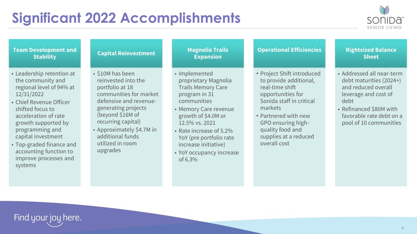 Non-GAAP Financial Measures 3 This presentation contains financial measures (1) same-store Resident Revenue, (2) same-store Adjusted Operating Expenses, (3) same-store Community Net Operating Income, (4) same-store Community Net Operating Income Margin, (5) Revenue per Occupied Unit (RevPOR) and (6) Revenue per Available Unit (RevPAR) which are not calculated in accordance with U.S. Generally Accepted Accounting Principles ("GAAP"). Presentations of these non-GAAP financial measures are intended to aid investors in better understanding the factors and trends affecting the Company’s performance and liquidity. However, investors should not consider these non-GAAP financial measures as a substitute for financial measures determined in accordance with GAAP, including net income (loss), income (loss) from operations, or net cash provided by (used in) operating activities. Investors are cautioned that amounts presented in accordance with the Company’s definitions of these non-GAAP financial measures may not be comparable to similar measures disclosed by other companies because not all companies calculate non-GAAP measures in the same manner. Investors are urged to review the reconciliations of these non-GAAP financial measures from the most comparable financial measures determined in accordance with GAAP contained in the Company’smost recent earnings release issued on March 30, 2023. Same-store Resident Revenue is a non-GAAP performance measure for the Company’s portfolio of 60 continuing communities that excludes revenue from non-same-store communities acquired or divested in the presented periods. Same-store Adjusted Operating Expenses, Net Operating Income and Same-store Community Net Operating Income Margin are non-GAAP performance measures for the Company’s portfolio of 60 continuing communities that the Company defines as net income (loss) excluding: general and administrative expenses, interest income, interest expense, other income/expense, provision for income taxes, settlement fees and expenses, revenue and operating expenses from the Company’s disposed properties; and further adjusted to exclude income/expense associated with non-cash, non- operational, transactional, or organizational restructuring items that management does not consider as part of the Company’s underlying core operating performance and that management believes impact the comparability of performance between periods. For the periods presented herein, such other items include depreciation and amortization expense, gain(loss) on extinguishment of debt, gain(loss) on disposition of assets, long-lived asset impairment, and loss on non-recurring settlements with third parties. RevPAR, or average monthly revenue per available unit, is defined by the Company as resident revenue for the period, divided by the weighted average number of available units in the corresponding portfolio for the period, divided by the number of months in the period. RevPOR, or average monthly revenue per occupied unit, is defined by the Company as resident revenue for the period, divided by the weighted average number of occupied units in the corresponding portfolio for the period, divided by the number of months in the period. The Company believes that presentation of same-store Resident Revenue, Adjusted Operating Expenses, Community Net Operating Income and Community Net Operating Income Margin as performance measures are useful to investors because (i) they are some of the metrics used by the Company’s management to evaluate the performance of our core portfolio of 60 continuing communities, to review the Company’s comparable historic and prospective core operating performance of the 60 continuing communities, and to make day-to-day operating decisions; (ii) they provide an assessment of operational factors that management can impact in the short-term, namely revenues and the controllable cost structure of the organization, by eliminating items related to the Company’s financing and capital structure and other items that management does not consider as part of the Company’s underlying core operating performance and that management believes impact the comparability of performance between periods. Same-store Adjusted Operating Expenses, Net Operating Income and Same-store Community Net Operating Income Margin have material limitations as a performance measure, including: (i) excluded interest is necessary to operate the Company’s business under its current financing and capital structure; (ii) excluded depreciation, amortization and impairment charges may represent the wear and tear and/or reduction in value of the Company’s communities, and other assets and may be indicative of future needs for capital expenditures; and (iii) the Company may incur income/expense similar to those for which adjustments are made, such as gain/loss on sale of assets, facility lease termination, or debt extinguishment, non-cash stock-based compensation expense, and transaction and other costs, and such income/expense may significantly affect the Company’soperating results.