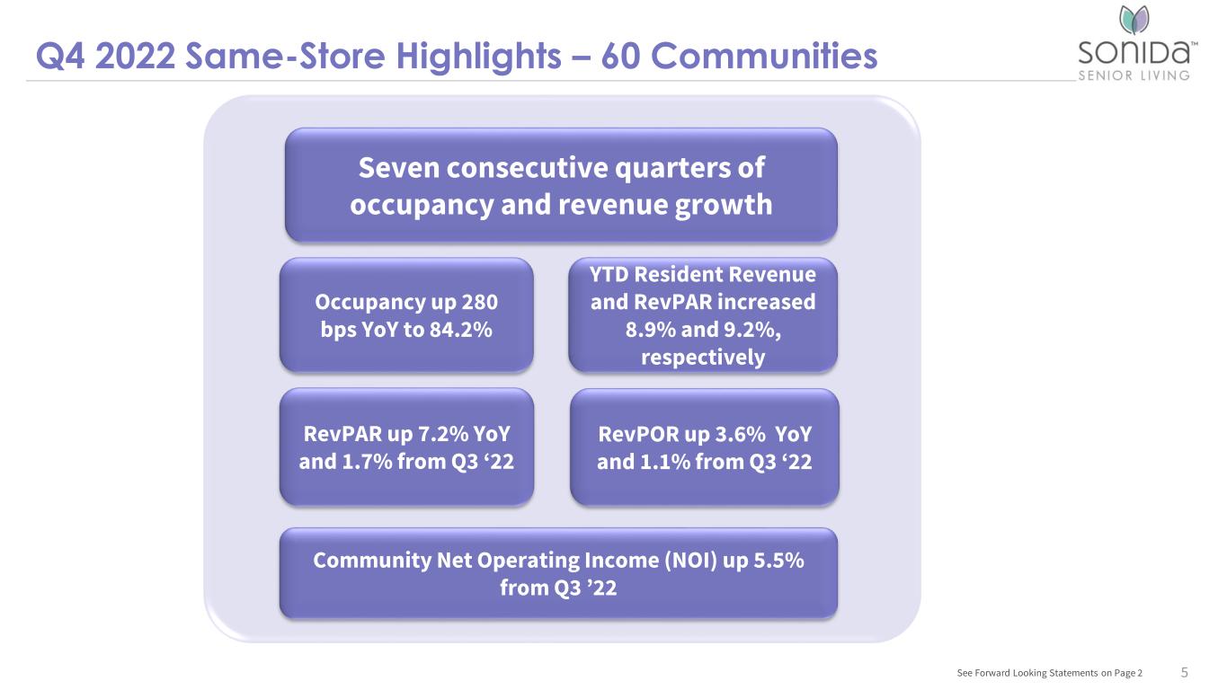 Significant 2022 Accomplishments Team Development and Stability • Leadership retention at the community and regional level of 94% at 12/31/2022 • Chief Revenue Officer shifted focus to acceleration of rate growth supported by programming and capital investment • Top-graded finance and accounting function to improve processes and systems Capital Reinvestment • $10M has been reinvested into the portfolio at 18 communities for market defensive and revenue- generating projects (beyond $16M of recurring capital) • Approximately $4.7M in additional funds utilized in room upgrades Magnolia Trails Expansion • Implemented proprietary Magnolia Trails Memory Care program in 31 communities • Memory Care revenue growth of $4.0M or 12.5% vs. 2021 • Rate increase of 5.2% YoY (pre portfolio rate increase initiative) • YoY occupancy increase of 6.3% Operational Efficiencies • Project Shift introduced to provide additional, real-time shift opportunities for Sonida staff in critical markets • Partnered with new GPO ensuring high- quality food and supplies at a reduced overall cost Rightsized Balance Sheet • Addressed all near-term debt maturities (2024+) and reduced overall leverage and cost of debt • Refinanced $80M with favorable rate debt on a pool of 10 communities 4