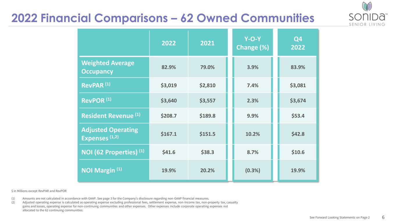 Q4 2022 Same-Store Highlights – 60 Communities Occupancy up 280 bps YoY to 84.2% Seven consecutive quarters of occupancy and revenue growth RevPOR up 3.6% YoY and 1.1% from Q3 ‘22 YTD Resident Revenue and RevPAR increased 8.9% and 9.2%, respectively Community Net Operating Income (NOI) up 5.5% from Q3 ’22 RevPAR up 7.2% YoY and 1.7% from Q3 ‘22 5See Forward Looking Statements on Page 2