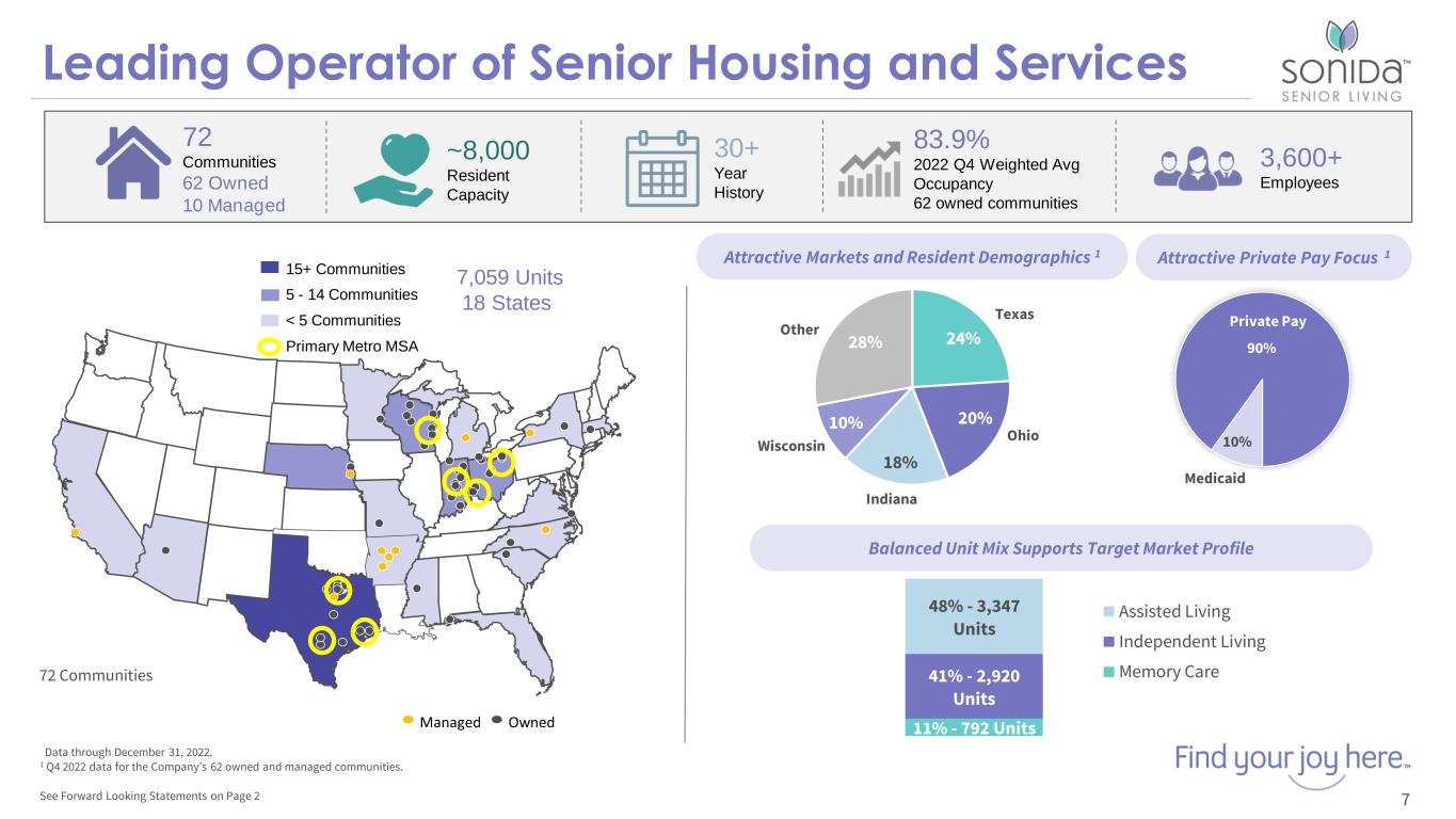 2022 Financial Comparisons – 62 Owned Communities 6See Forward Looking Statements on Page 2 $ in Millions except RevPAR and RevPOR (1) Amounts are not calculated in accordance with GAAP. See page 3 for the Company’s disclosure regarding non-GAAP financial measures. (2) Adjusted operating expense is calculated as operating expense excluding professional fees, settlement expense, non-income tax, non-property tax, casualty gains and losses, operating expense for non-continuing communities and other expenses. Other expenses include corporate operating expenses not allocated to the 62 continuing communities. 2022 2021 Y-O-Y Change (%) Q4 2022 Weighted Average Occupancy 82.9% 79.0% 3.9% 83.9% RevPAR (1) $3,019 $2,810 7.4% $3,081 RevPOR (1) $3,640 $3,557 2.3% $3,674 Resident Revenue (1) $208.7 $189.8 9.9% $53.4 Adjusted Operating Expenses (1,2) $167.1 $151.5 10.2% $42.8 NOI (62 Properties) (1) $41.6 $38.3 8.7% $10.6 NOI Margin (1) 19.9% 20.2% (0.3%) 19.9%