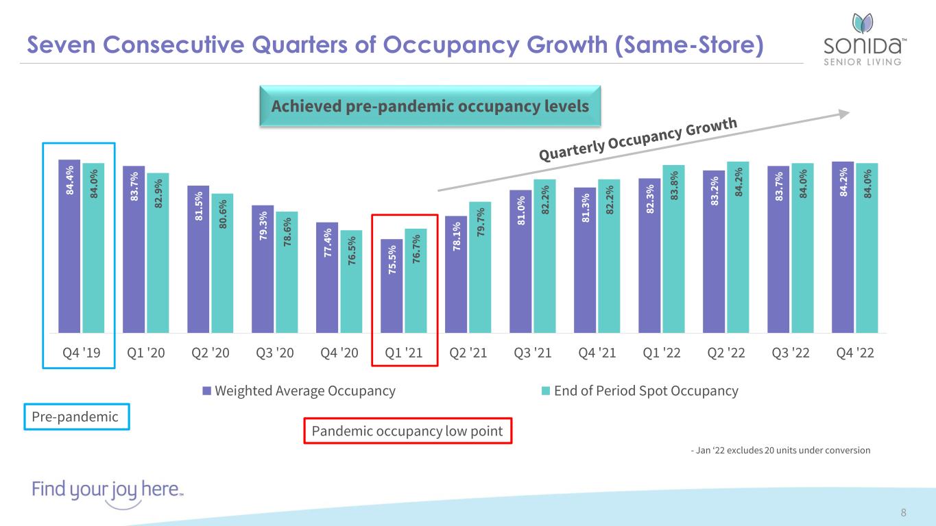 24% 20% 18% 10% 28% Texas Ohio Wisconsin Indiana Other 10% 90% Medicaid Private Pay 72 Communities 62 Owned 10 Managed ~8,000 Resident Capacity 3,600+ Employees 83.9% 2022 Q4 Weighted Avg Occupancy 62 owned communities 30+ Year History Leading Operator of Senior Housing and Services 7 72 Communities 11% - 792 Units 41% - 2,920 Units 48% - 3,347 Units Assisted Living Independent Living Memory Care Attractive Markets and Resident Demographics 1 Balanced Unit Mix Supports Target Market Profile Attractive Private Pay Focus 1 15+ Communities 5 - 14 Communities < 5 Communities Primary Metro MSA 7,059 Units 18 States OwnedManaged Data through December 31, 2022. 1 Q4 2022 data for the Company’s 62 owned and managed communities. See Forward Looking Statements on Page 2