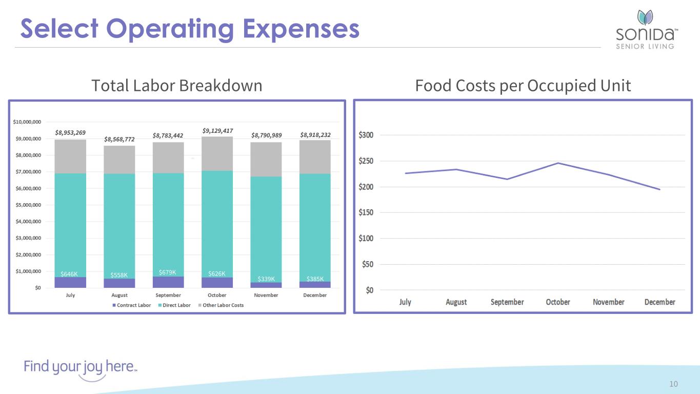 Select Operating Expenses 10 $8,953,269 $8,568,772 $8,783,442 $9,129,417 $8,790,989 $8,918,232 Total Labor Breakdown Food Costs per Occupied Unit $646K $558K $679K $626K $339K $385K