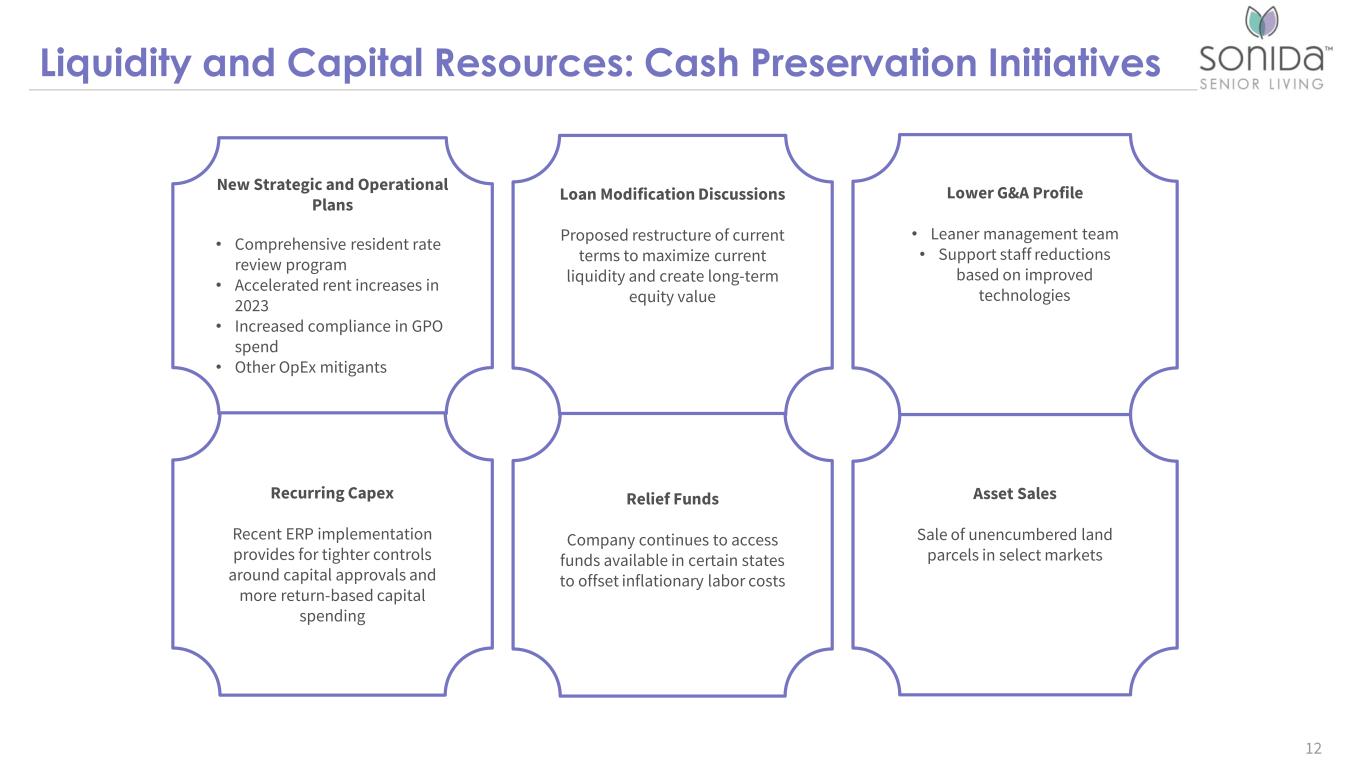 Liquidity and Capital Resources: Cash Preservation Initiatives 12 New Strategic and Operational Plans • Comprehensive resident rate review program • Accelerated rent increases in 2023 • Increased compliance in GPO spend • Other OpEx mitigants Loan Modification Discussions Proposed restructure of current terms to maximize current liquidity and create long-term equity value Lower G&A Profile • Leaner management team • Support staff reductions based on improved technologies Recurring Capex Recent ERP implementation provides for tighter controls around capital approvals and more return-based capital spending Relief Funds Company continues to access funds available in certain states to offset inflationary labor costs Asset Sales Sale of unencumbered land parcels in select markets
