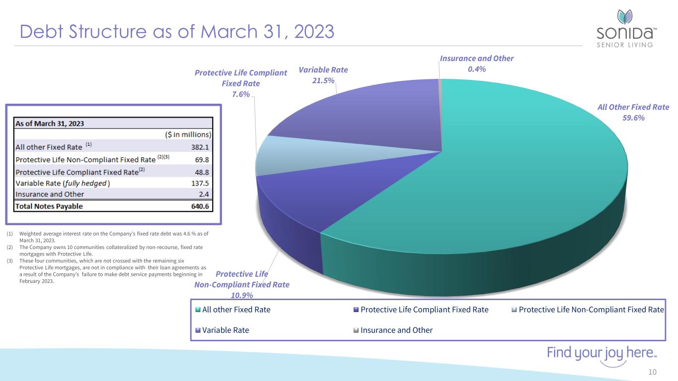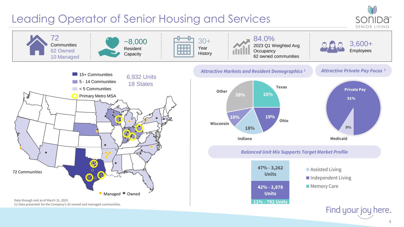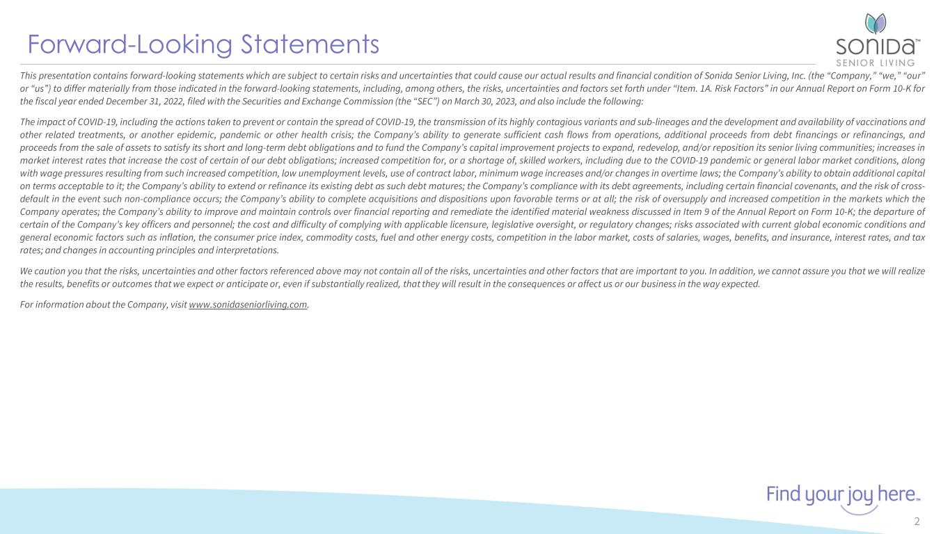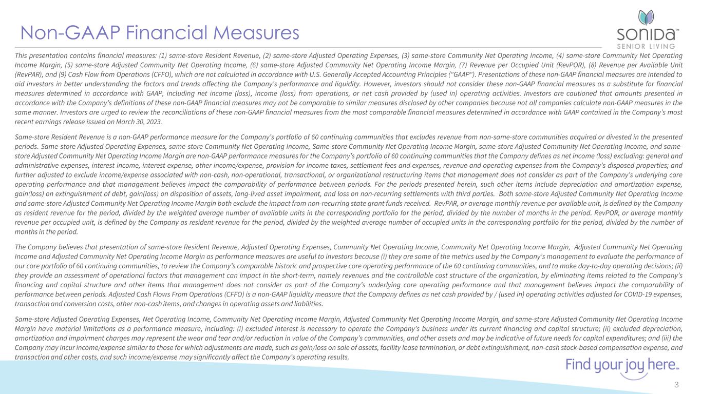 Forward-Looking Statements 2 This presentation contains forward-looking statements which are subject to certain risks and uncertainties that could cause our actual results and financial condition of Sonida Senior Living, Inc. (the “Company,” “we,” “our” or “us”) to differ materially from those indicated in the forward-looking statements, including, among others, the risks, uncertainties and factors set forth under “Item. 1A. Risk Factors” in our Annual Report on Form 10-K for the fiscal year ended December 31, 2022, filed with the Securities and Exchange Commission (the “SEC”) on March 30, 2023, and also include the following: The impact of COVID-19, including the actions taken to prevent or contain the spread of COVID-19, the transmission of its highly contagious variants and sub-lineages and the development and availability of vaccinations and other related treatments, or another epidemic, pandemic or other health crisis; the Company’s ability to generate sufficient cash flows from operations, additional proceeds from debt financings or refinancings, and proceeds from the sale of assets to satisfy its short and long-term debt obligations and to fund the Company’s capital improvement projects to expand, redevelop, and/or reposition its senior living communities; increases in market interest rates that increase the cost of certain of our debt obligations; increased competition for, or a shortage of, skilled workers, including due to the COVID-19 pandemic or general labor market conditions, along with wage pressures resulting from such increased competition, low unemployment levels, use of contract labor, minimum wage increases and/or changes in overtime laws; the Company’s ability to obtain additional capital on terms acceptable to it; the Company’s ability to extend or refinance its existing debt as such debt matures; the Company’s compliance with its debt agreements, including certain financial covenants, and the risk of cross- default in the event such non-compliance occurs; the Company’s ability to complete acquisitions and dispositions upon favorable terms or at all; the risk of oversupply and increased competition in the markets which the Company operates; the Company’s ability to improve and maintain controls over financial reporting and remediate the identified material weakness discussed in Item 9 of the Annual Report on Form 10-K; the departure of certain of the Company’s key officers and personnel; the cost and difficulty of complying with applicable licensure, legislative oversight, or regulatory changes; risks associated with current global economic conditions and general economic factors such as inflation, the consumer price index, commodity costs, fuel and other energy costs, competition in the labor market, costs of salaries, wages, benefits, and insurance, interest rates, and tax rates; and changes in accounting principles and interpretations. We caution you that the risks, uncertainties and other factors referenced above may not contain all of the risks, uncertainties and other factors that are important to you. In addition, we cannot assure you that we will realize the results, benefits or outcomes that we expect or anticipate or, even if substantially realized, that they will result in the consequences or affect us or our business in the way expected. For information about the Company, visit www.sonidaseniorliving.com.