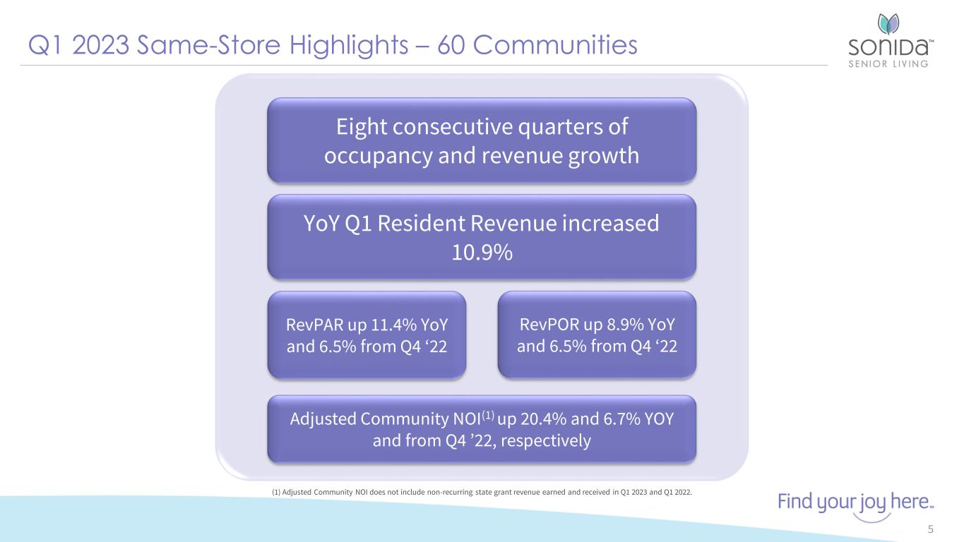 25% 19% 18% 10% 28% Texas Ohio Wisconsin Indiana Other 9% 91% Medicaid Private Pay 72 Communities 62 Owned 10 Managed ~8,000 Resident Capacity 3,600+ Employees 84.0% 2023 Q1 Weighted Avg Occupancy 62 owned communities 30+ Year History Leading Operator of Senior Housing and Services 4 72 Communities 11% - 792 Units 42% - 2,878 Units 47% - 3,262 Units Assisted Living Independent Living Memory Care Attractive Markets and Resident Demographics 1 Balanced Unit Mix Supports Target Market Profile Attractive Private Pay Focus 1 15+ Communities 5 - 14 Communities < 5 Communities Primary Metro MSA 6,932 Units 18 States OwnedManaged Data through and as of March 31, 2023. (1) Data presented for the Company’s 62 owned and managed communities.