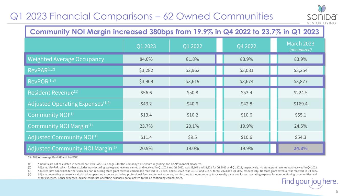Q1 2023 Same-Store Highlights – 60 Communities 5 Eight consecutive quarters of occupancy and revenue growth RevPOR up 8.9% YoY and 6.5% from Q4 ‘22 YoY Q1 Resident Revenue increased 10.9% Adjusted Community NOI(1) up 20.4% and 6.7% YOY and from Q4 ’22, respectively RevPAR up 11.4% YoY and 6.5% from Q4 ‘22 (1) Adjusted Community NOI does not include non-recurring state grant revenue earned and received in Q1 2023 and Q1 2022.
