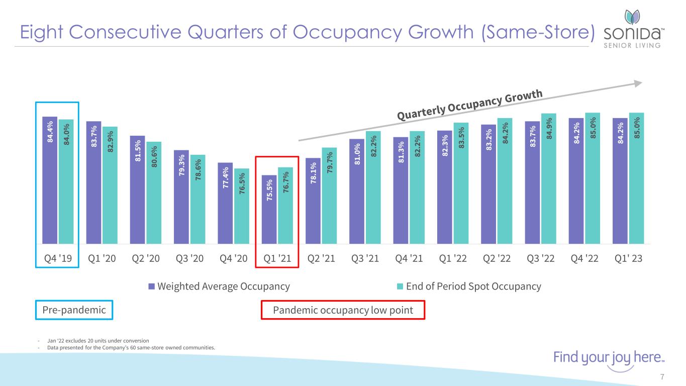 Q1 2023 Financial Comparisons – 62 Owned Communities 6 $ in Millions except RevPAR and RevPOR (1) Amounts are not calculated in accordance with GAAP. See page 3 for the Company’s disclosure regarding non-GAAP financial measures. (2) Adjusted RevPAR, which further excludes non-recurring state grant revenue earned and received in Q1 2023 and Q1 2022, was $3,164 and $2,922 for Q1 2023 and Q1 2022, respectively. No state grant revenue was received in Q4 2022. (3) Adjusted RevPOR, which further excludes non-recurring state grant revenue earned and received in Q1 2023 and Q1 2022, was $3,769 and $3,570 for Q1 2023 and Q1 2022, respectively. No state grant revenue was received in Q4 2022. (4) Adjusted operating expense is calculated as operating expense excluding professional fees, settlement expense, non-income tax, non-property tax, casualty gains and losses, operating expense for non-continuing communities and other expenses. Other expenses include corporate operating expenses not allocated to the 62 continuing communities. Q1 2023 Q1 2022 Q4 2022 March 2023 (annualized) Weighted Average Occupancy 84.0% 81.8% 83.9% 83.9% RevPAR(1,2) $3,282 $2,962 $3,081 $3,254 RevPOR(1,3) $3,909 $3,619 $3,674 $3,877 Resident Revenue(1) $56.6 $50.8 $53.4 $224.5 Adjusted Operating Expenses(1,4) $43.2 $40.6 $42.8 $169.4 Community NOI(1) $13.4 $10.2 $10.6 $55.1 Community NOI Margin(1) 23.7% 20.1% 19.9% 24.5% Adjusted Community NOI(1) $11.4 $9.5 $10.6 $54.3 Adjusted Community NOI Margin(1) 20.9% 19.0% 19.9% 24.3% Community NOI Margin increased 380bps from 19.9% in Q4 2022 to 23.7% in Q1 2023