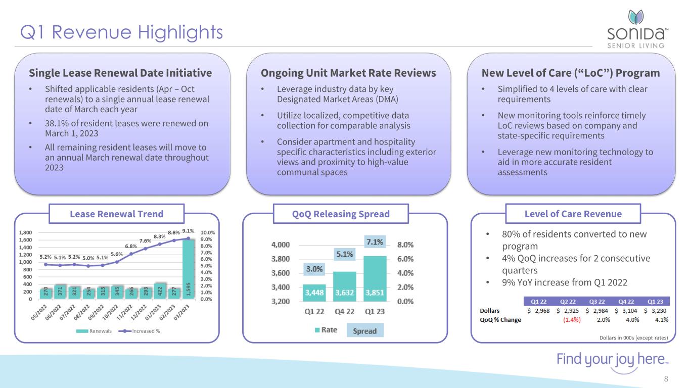 8 4 .4 % 8 3 .7 % 8 1 .5 % 7 9 .3 % 7 7 .4 % 7 5 .5 % 7 8 .1 % 8 1 .0 % 8 1 .3 % 8 2 .3 % 8 3 .2 % 8 3 .7 % 8 4 .2 % 8 4 .2 % 8 4 .0 % 8 2 .9 % 8 0 .6 % 7 8 .6 % 7 6 .5 % 7 6 .7 % 7 9 .7 % 8 2 .2 % 8 2 .2 % 8 3 .5 % 8 4 .2 % 8 4 .9 % 8 5 .0 % 8 5 .0 % Q4 '19 Q1 '20 Q2 '20 Q3 '20 Q4 '20 Q1 '21 Q2 '21 Q3 '21 Q4 '21 Q1 '22 Q2 '22 Q3 '22 Q4 '22 Q1' 23 Weighted Average Occupancy End of Period Spot Occupancy Eight Consecutive Quarters of Occupancy Growth (Same-Store) 7 Pandemic occupancy low pointPre-pandemic - Jan ‘22 excludes 20 units under conversion - Data presented for the Company’s 60 same-store owned communities.