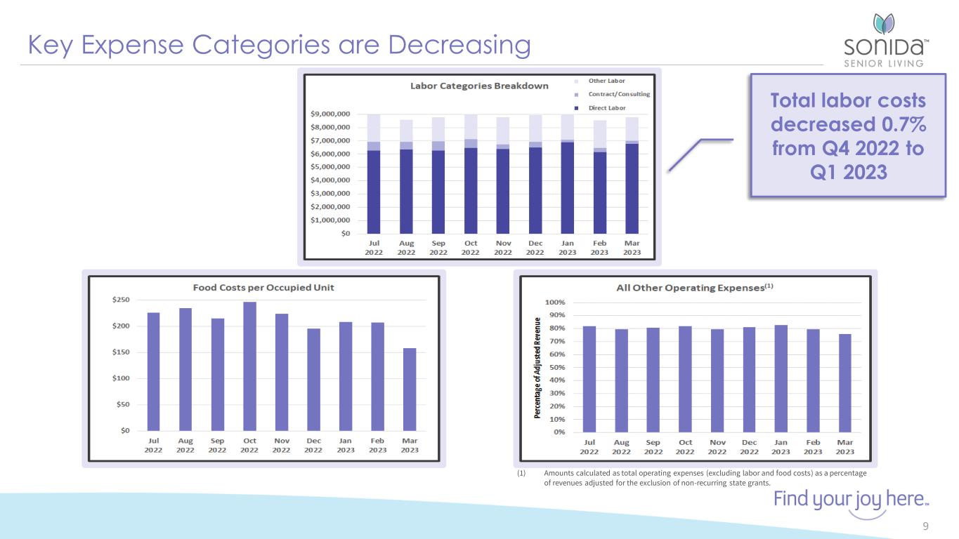 Q1 Revenue Highlights 8 Single Lease Renewal Date Initiative • Shifted applicable residents (Apr – Oct renewals) to a single annual lease renewal date of March each year • 38.1% of resident leases were renewed on March 1, 2023 • All remaining resident leases will move to an annual March renewal date throughout 2023 New Level of Care (“LoC”) Program • Simplified to 4 levels of care with clear requirements • New monitoring tools reinforce timely LoC reviews based on company and state-specific requirements • Leverage new monitoring technology to aid in more accurate resident assessments Ongoing Unit Market Rate Reviews • Leverage industry data by key Designated Market Areas (DMA) • Utilize localized, competitive data collection for comparable analysis • Consider apartment and hospitality specific characteristics including exterior views and proximity to high-value communal spaces QoQ Releasing Spread Level of Care RevenueLease Renewal Trend • 80% of residents converted to new program • 4% QoQ increases for 2 consecutive quarters • 9% YoY increase from Q1 2022 Dollars in 000s (except rates)