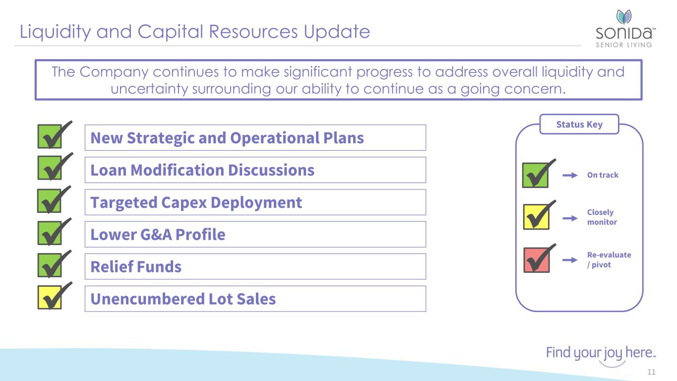 Debt Structure as of March 31, 2023 10 All Other Fixed Rate 59.6% Protective Life Non-Compliant Fixed Rate 10.9% Protective Life Compliant Fixed Rate 7.6% Variable Rate 21.5% Insurance and Other 0.4% All other Fixed Rate Protective Life Compliant Fixed Rate Protective Life Non-Compliant Fixed Rate Variable Rate Insurance and Other (1) Weighted average interest rate on the Company’s fixed rate debt was 4.6 % as of March 31, 2023. (2) The Company owns 10 communities collateralized by non-recourse, fixed rate mortgages with Protective Life. (3) These four communities, which are not crossed with the remaining six Protective Life mortgages, are not in compliance with their loan agreements as a result of the Company’s failure to make debt service payments beginning in February 2023.