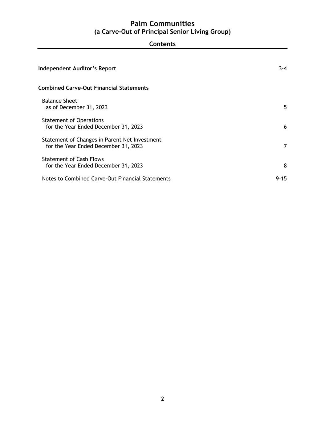 Palm Communities (a Carve-Out of Principal Senior Living Group) Contents 2 Independent Auditor’s Report 3-4 Combined Carve-Out Financial Statements Balance Sheet as of December 31, 2023 5 Statement of Operations for the Year Ended December 31, 2023 6 Statement of Changes in Parent Net Investment for the Year Ended December 31, 2023 7 Statement of Cash Flows for the Year Ended December 31, 2023 8 Notes to Combined Carve-Out Financial Statements 9-15