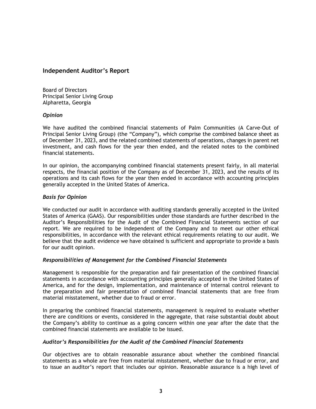 3 Independent Auditor’s Report Board of Directors Principal Senior Living Group Alpharetta, Georgia Opinion We have audited the combined financial statements of Palm Communities (A Carve-Out of Principal Senior Living Group) (the “Company”), which comprise the combined balance sheet as of December 31, 2023, and the related combined statements of operations, changes in parent net investment, and cash flows for the year then ended, and the related notes to the combined financial statements. In our opinion, the accompanying combined financial statements present fairly, in all material respects, the financial position of the Company as of December 31, 2023, and the results of its operations and its cash flows for the year then ended in accordance with accounting principles generally accepted in the United States of America. Basis for Opinion We conducted our audit in accordance with auditing standards generally accepted in the United States of America (GAAS). Our responsibilities under those standards are further described in the Auditor’s Responsibilities for the Audit of the Combined Financial Statements section of our report. We are required to be independent of the Company and to meet our other ethical responsibilities, in accordance with the relevant ethical requirements relating to our audit. We believe that the audit evidence we have obtained is sufficient and appropriate to provide a basis for our audit opinion. Responsibilities of Management for the Combined Financial Statements Management is responsible for the preparation and fair presentation of the combined financial statements in accordance with accounting principles generally accepted in the United States of America, and for the design, implementation, and maintenance of internal control relevant to the preparation and fair presentation of combined financial statements that are free from material misstatement, whether due to fraud or error. In preparing the combined financial statements, management is required to evaluate whether there are conditions or events, considered in the aggregate, that raise substantial doubt about the Company’s ability to continue as a going concern within one year after the date that the combined financial statements are available to be issued. Auditor’s Responsibilities for the Audit of the Combined Financial Statements Our objectives are to obtain reasonable assurance about whether the combined financial statements as a whole are free from material misstatement, whether due to fraud or error, and to issue an auditor’s report that includes our opinion. Reasonable assurance is a high level of