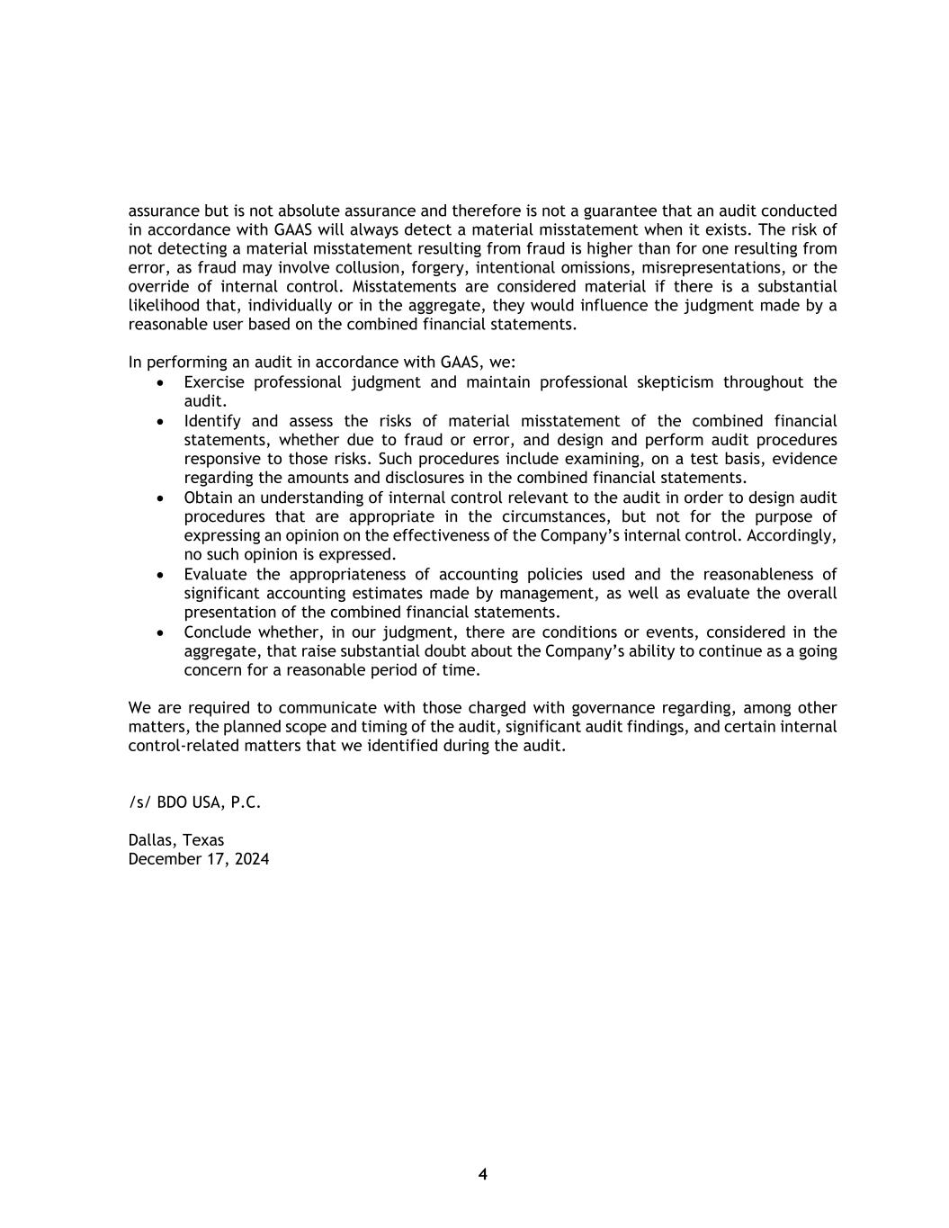 4 assurance but is not absolute assurance and therefore is not a guarantee that an audit conducted in accordance with GAAS will always detect a material misstatement when it exists. The risk of not detecting a material misstatement resulting from fraud is higher than for one resulting from error, as fraud may involve collusion, forgery, intentional omissions, misrepresentations, or the override of internal control. Misstatements are considered material if there is a substantial likelihood that, individually or in the aggregate, they would influence the judgment made by a reasonable user based on the combined financial statements. In performing an audit in accordance with GAAS, we: • Exercise professional judgment and maintain professional skepticism throughout the audit. • Identify and assess the risks of material misstatement of the combined financial statements, whether due to fraud or error, and design and perform audit procedures responsive to those risks. Such procedures include examining, on a test basis, evidence regarding the amounts and disclosures in the combined financial statements. • Obtain an understanding of internal control relevant to the audit in order to design audit procedures that are appropriate in the circumstances, but not for the purpose of expressing an opinion on the effectiveness of the Company’s internal control. Accordingly, no such opinion is expressed. • Evaluate the appropriateness of accounting policies used and the reasonableness of significant accounting estimates made by management, as well as evaluate the overall presentation of the combined financial statements. • Conclude whether, in our judgment, there are conditions or events, considered in the aggregate, that raise substantial doubt about the Company’s ability to continue as a going concern for a reasonable period of time. We are required to communicate with those charged with governance regarding, among other matters, the planned scope and timing of the audit, significant audit findings, and certain internal control-related matters that we identified during the audit. /s/ BDO USA, P.C. Dallas, Texas December 17, 2024