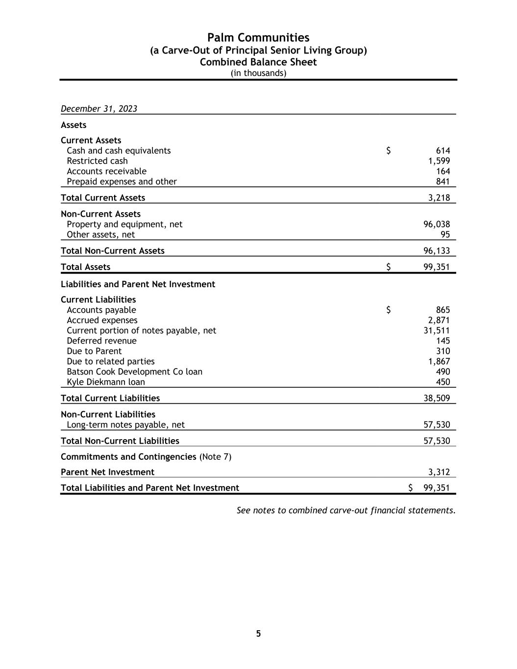 Palm Communities (a Carve-Out of Principal Senior Living Group) Combined Balance Sheet (in thousands) 5 December 31, 2023 Assets Current Assets Cash and cash equivalents $ 614 Restricted cash 1,599 Accounts receivable 164 Prepaid expenses and other 841 Total Current Assets 3,218 Non-Current Assets Property and equipment, net 96,038 Other assets, net 95 Total Non-Current Assets 96,133 Total Assets $ 99,351 Liabilities and Parent Net Investment Current Liabilities Accounts payable $ 865 Accrued expenses 2,871 Current portion of notes payable, net 31,511 Deferred revenue 145 Due to Parent 310 Due to related parties 1,867 Batson Cook Development Co loan 490 Kyle Diekmann loan 450 Total Current Liabilities 38,509 Non-Current Liabilities Long-term notes payable, net 57,530 Total Non-Current Liabilities 57,530 Commitments and Contingencies (Note 7) Parent Net Investment 3,312 Total Liabilities and Parent Net Investment $ 99,351 See notes to combined carve-out financial statements.