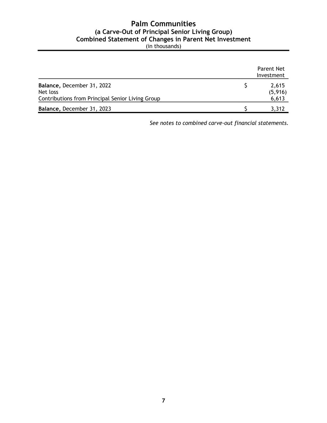 Palm Communities (a Carve-Out of Principal Senior Living Group) Combined Statement of Changes in Parent Net Investment (in thousands) 7 Parent Net Investment Balance, December 31, 2022 $ 2,615 Net loss (5,916) Contributions from Principal Senior Living Group 6,613 Balance, December 31, 2023 $ 3,312 See notes to combined carve-out financial statements.