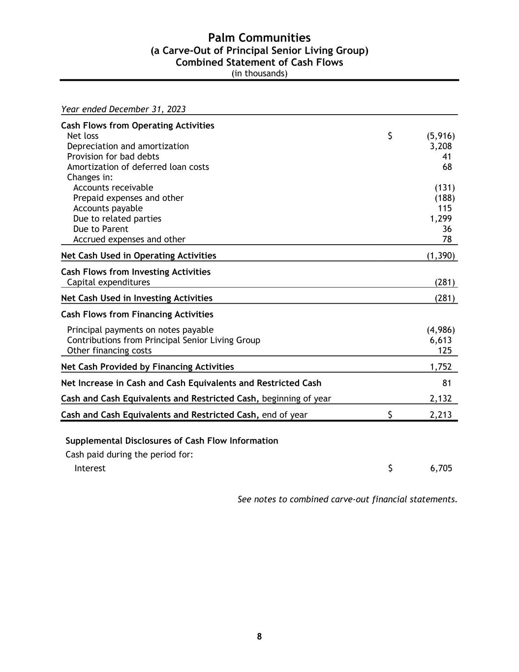Palm Communities (a Carve-Out of Principal Senior Living Group) Combined Statement of Cash Flows (in thousands) 8 Year ended December 31, 2023 Cash Flows from Operating Activities Net loss $ (5,916) Depreciation and amortization 3,208 Provision for bad debts 41 Amortization of deferred loan costs 68 Changes in: Accounts receivable (131) Prepaid expenses and other (188) Accounts payable 115 Due to related parties 1,299 Due to Parent 36 Accrued expenses and other 78 Net Cash Used in Operating Activities (1,390) Cash Flows from Investing Activities Capital expenditures (281) Net Cash Used in Investing Activities (281) Cash Flows from Financing Activities Principal payments on notes payable (4,986) Contributions from Principal Senior Living Group 6,613 Other financing costs 125 Net Cash Provided by Financing Activities 1,752 Net Increase in Cash and Cash Equivalents and Restricted Cash 81 Cash and Cash Equivalents and Restricted Cash, beginning of year 2,132 Cash and Cash Equivalents and Restricted Cash, end of year $ 2,213 Supplemental Disclosures of Cash Flow Information Cash paid during the period for: Interest $ 6,705 See notes to combined carve-out financial statements.