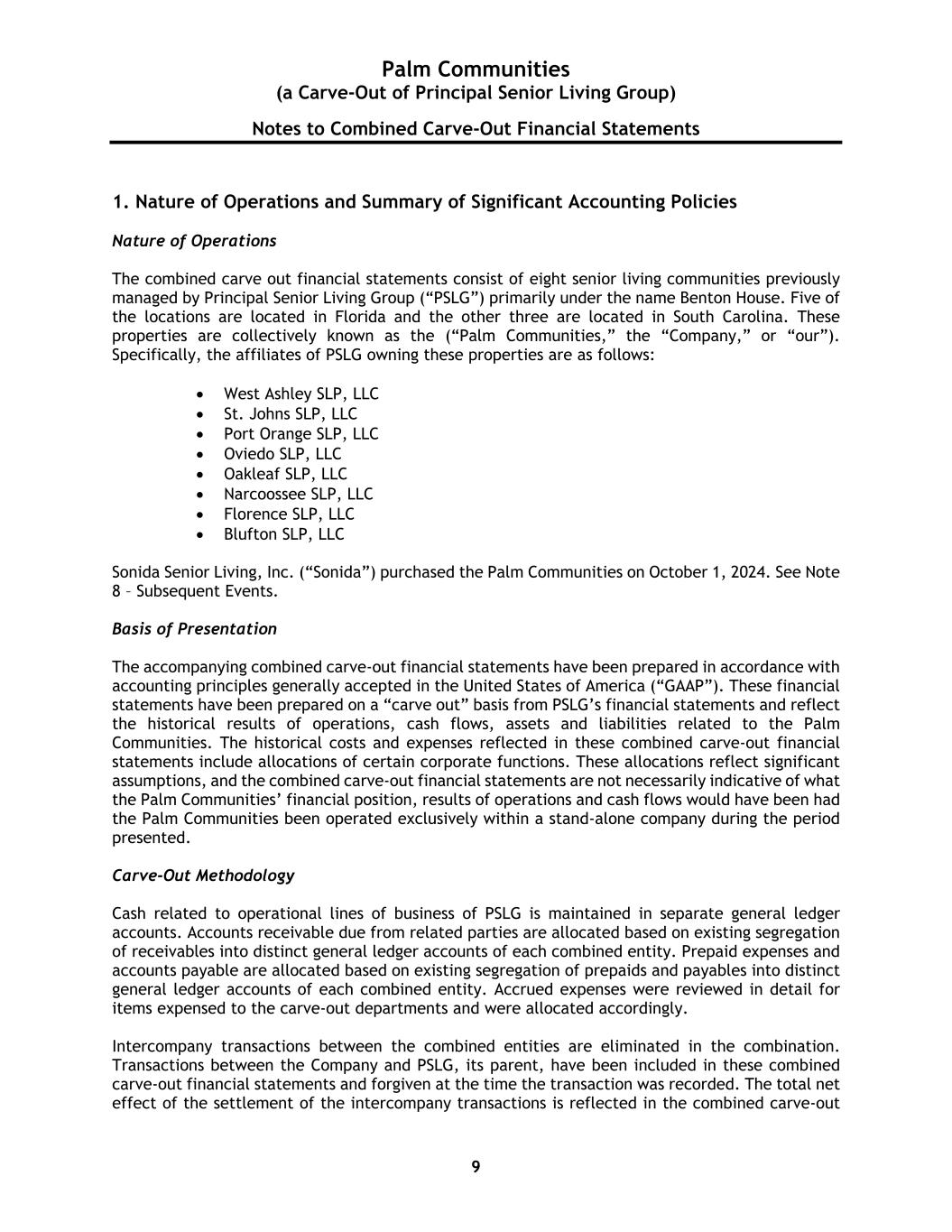 Palm Communities (a Carve-Out of Principal Senior Living Group) Notes to Combined Carve-Out Financial Statements 9 1. Nature of Operations and Summary of Significant Accounting Policies Nature of Operations The combined carve out financial statements consist of eight senior living communities previously managed by Principal Senior Living Group (“PSLG”) primarily under the name Benton House. Five of the locations are located in Florida and the other three are located in South Carolina. These properties are collectively known as the (“Palm Communities,” the “Company,” or “our”). Specifically, the affiliates of PSLG owning these properties are as follows: • West Ashley SLP, LLC • St. Johns SLP, LLC • Port Orange SLP, LLC • Oviedo SLP, LLC • Oakleaf SLP, LLC • Narcoossee SLP, LLC • Florence SLP, LLC • Blufton SLP, LLC Sonida Senior Living, Inc. (“Sonida”) purchased the Palm Communities on October 1, 2024. See Note 8 – Subsequent Events. Basis of Presentation The accompanying combined carve-out financial statements have been prepared in accordance with accounting principles generally accepted in the United States of America (“GAAP”). These financial statements have been prepared on a “carve out” basis from PSLG’s financial statements and reflect the historical results of operations, cash flows, assets and liabilities related to the Palm Communities. The historical costs and expenses reflected in these combined carve-out financial statements include allocations of certain corporate functions. These allocations reflect significant assumptions, and the combined carve-out financial statements are not necessarily indicative of what the Palm Communities’ financial position, results of operations and cash flows would have been had the Palm Communities been operated exclusively within a stand-alone company during the period presented. Carve-Out Methodology Cash related to operational lines of business of PSLG is maintained in separate general ledger accounts. Accounts receivable due from related parties are allocated based on existing segregation of receivables into distinct general ledger accounts of each combined entity. Prepaid expenses and accounts payable are allocated based on existing segregation of prepaids and payables into distinct general ledger accounts of each combined entity. Accrued expenses were reviewed in detail for items expensed to the carve-out departments and were allocated accordingly. Intercompany transactions between the combined entities are eliminated in the combination. Transactions between the Company and PSLG, its parent, have been included in these combined carve-out financial statements and forgiven at the time the transaction was recorded. The total net effect of the settlement of the intercompany transactions is reflected in the combined carve-out