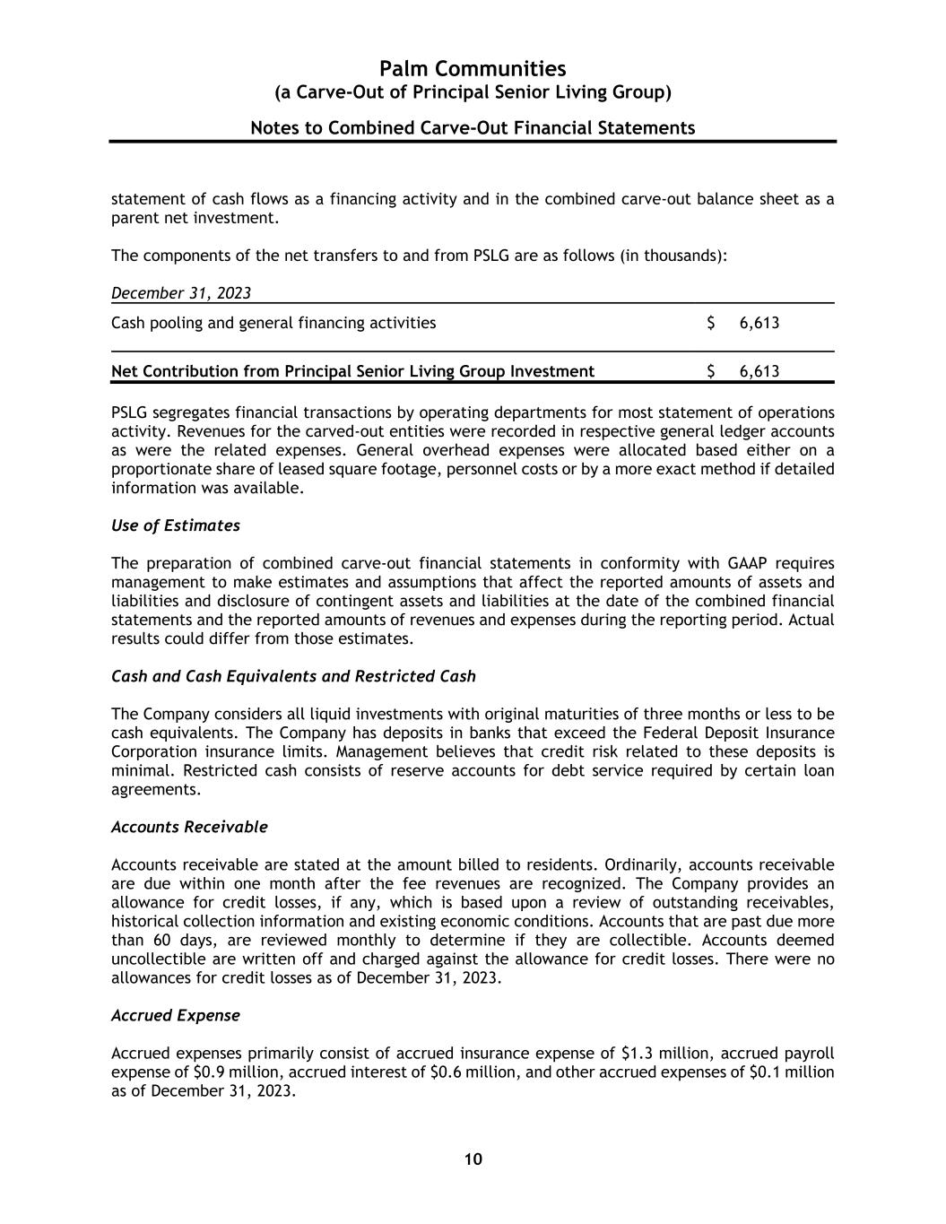 Palm Communities (a Carve-Out of Principal Senior Living Group) Notes to Combined Carve-Out Financial Statements 10 statement of cash flows as a financing activity and in the combined carve-out balance sheet as a parent net investment. The components of the net transfers to and from PSLG are as follows (in thousands): December 31, 2023 Cash pooling and general financing activities $ 6,613 Net Contribution from Principal Senior Living Group Investment $ 6,613 PSLG segregates financial transactions by operating departments for most statement of operations activity. Revenues for the carved-out entities were recorded in respective general ledger accounts as were the related expenses. General overhead expenses were allocated based either on a proportionate share of leased square footage, personnel costs or by a more exact method if detailed information was available. Use of Estimates The preparation of combined carve-out financial statements in conformity with GAAP requires management to make estimates and assumptions that affect the reported amounts of assets and liabilities and disclosure of contingent assets and liabilities at the date of the combined financial statements and the reported amounts of revenues and expenses during the reporting period. Actual results could differ from those estimates. Cash and Cash Equivalents and Restricted Cash The Company considers all liquid investments with original maturities of three months or less to be cash equivalents. The Company has deposits in banks that exceed the Federal Deposit Insurance Corporation insurance limits. Management believes that credit risk related to these deposits is minimal. Restricted cash consists of reserve accounts for debt service required by certain loan agreements. Accounts Receivable Accounts receivable are stated at the amount billed to residents. Ordinarily, accounts receivable are due within one month after the fee revenues are recognized. The Company provides an allowance for credit losses, if any, which is based upon a review of outstanding receivables, historical collection information and existing economic conditions. Accounts that are past due more than 60 days, are reviewed monthly to determine if they are collectible. Accounts deemed uncollectible are written off and charged against the allowance for credit losses. There were no allowances for credit losses as of December 31, 2023. Accrued Expense Accrued expenses primarily consist of accrued insurance expense of $1.3 million, accrued payroll expense of $0.9 million, accrued interest of $0.6 million, and other accrued expenses of $0.1 million as of December 31, 2023.
